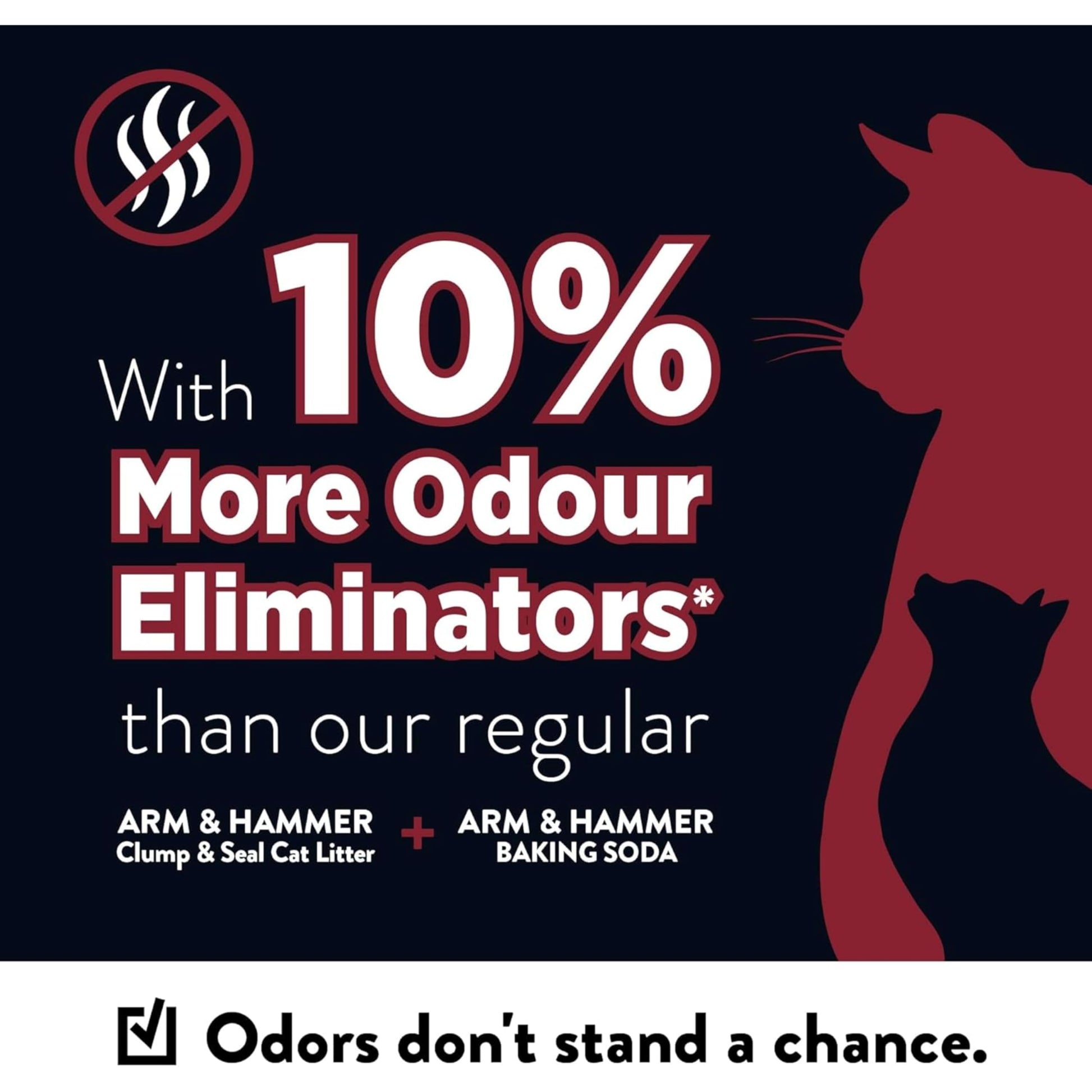 Keep your home fresh with ARM & HAMMER Clump & Seal Platinum Multi-Cat Clumping Cat Litter. Designed for multi-cat households, this premium litter guarantees 14 days of odor control. Featuring patented odor-sealing technology and 10% more odor eliminators than our standard formula, it locks in and destroys odors on contact. Moisture-activated micro-granules form rock-hard clumps for easy scooping. Infused with ARM & HAMMER Baking Soda, this litter is your go-to solution for powerful odor elimination and a cleaner litter box experience.