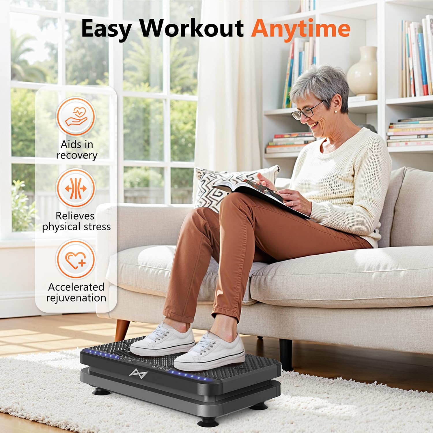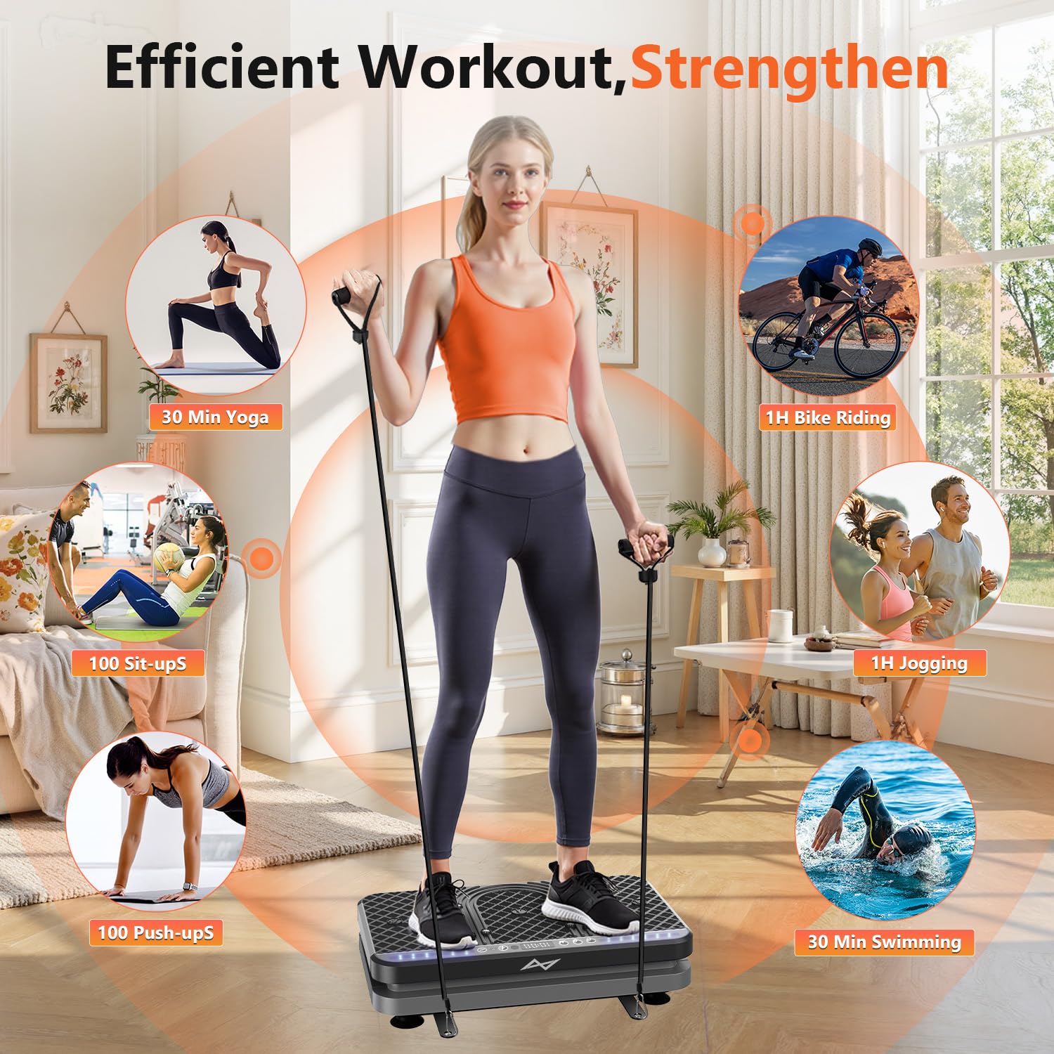 - ✅RICH FUNCTIONAL & HIGH EFFICIENT& REMOTE CONTROL: Adjustable vibration speed (1 to 120), with 2 resistance workout bands, can exercise upper body and lower body at the same time. Offering variety of exercise modes, allow you to try different vibration exercises, With this workout machine, you can have your routine exercise done in only 10 minutes everyday. What you’ll get is a better shape and enhanced metabolism, increased bone mineral density, relieve and reduce stress levels.