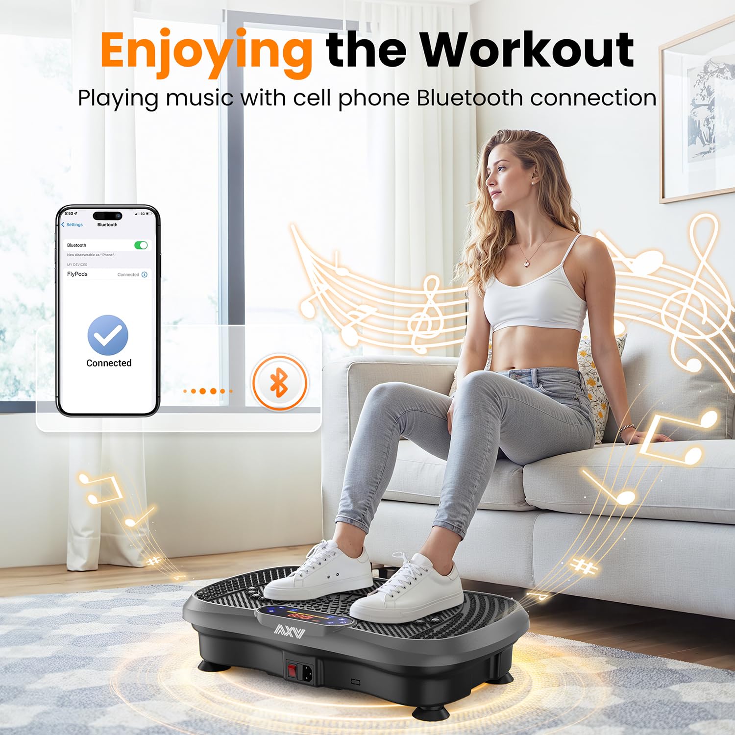 - ✅WHY WE CHOOSE AXV VIBRATION PLATE: Can be connected to phone via BT and used as BT speaker; Magnet health massage function; LED display shows time, speed and burnt fat making your workout visible; Compact size can be used anywhere & easy to carry and store; Anti-slip coating designed;Enhanced upgraded Ergonomic design shell ensures more durability and stability; Comes with Remote control ,Resistance Bands and detailed manual...everything you need.