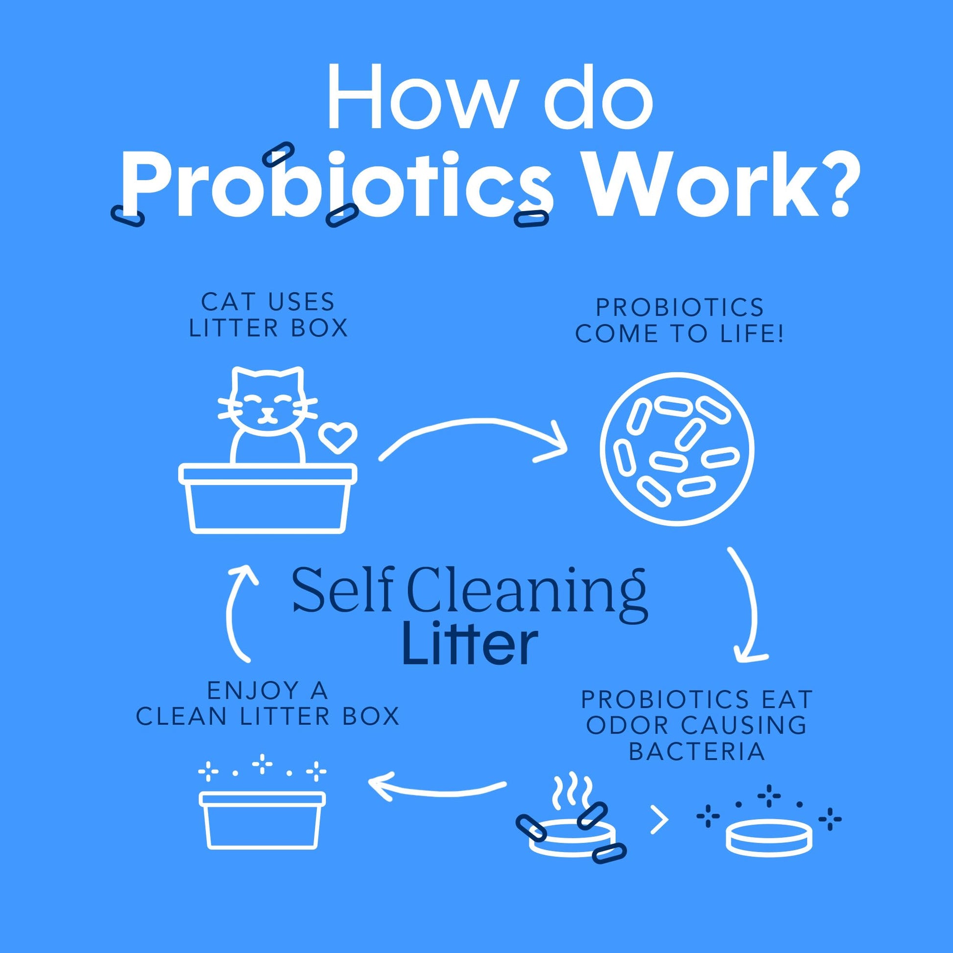 - EASY TO CLEAN: Self-cleaning due to blend of probiotics that work 24/7 to clean litter after every use. Clumps form on the top of the litter box, rather than sticking to the sides or bottom. Perfect for regular, sifting, and mechanical litter boxes.