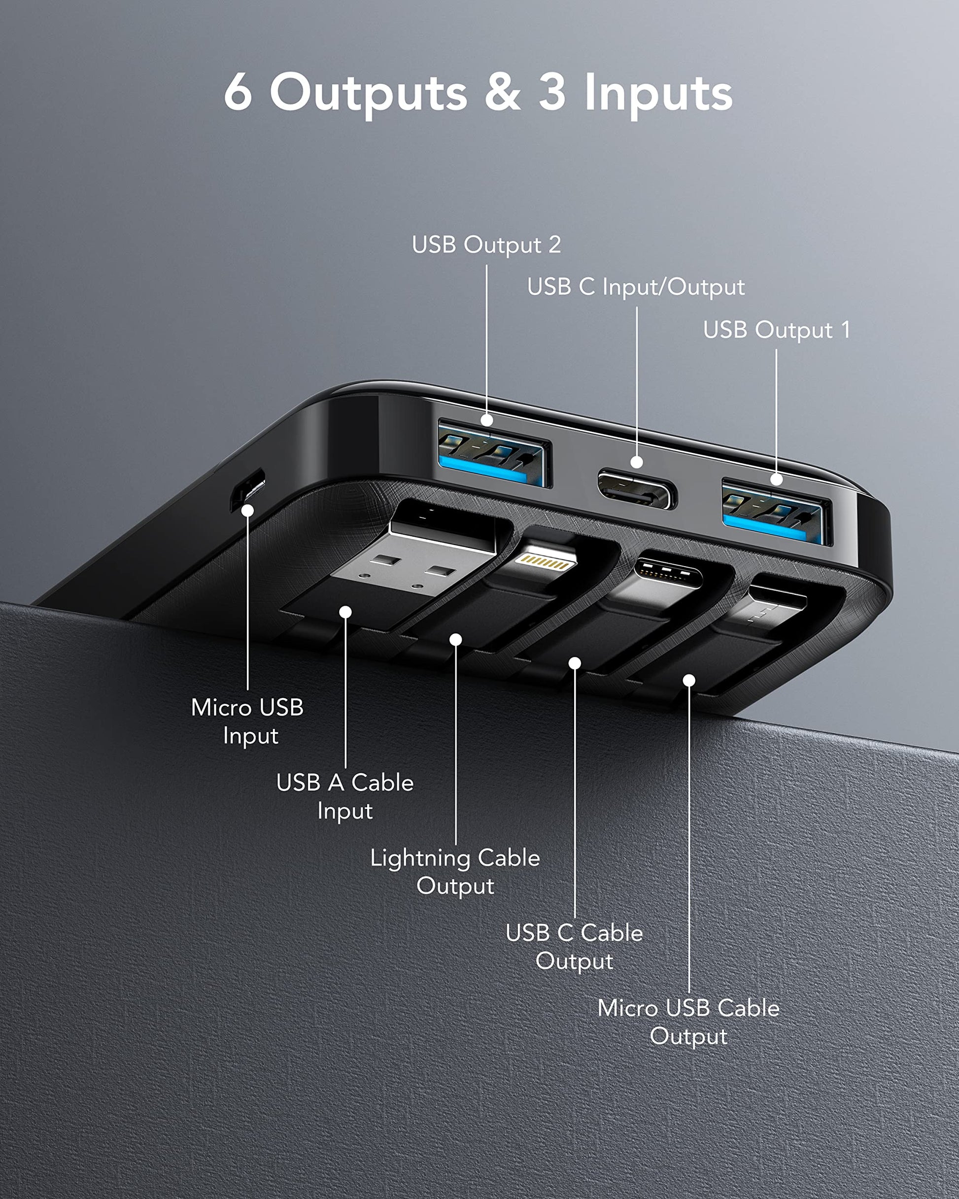 - đă6 Outputs and 3 InputsăPortable charger has 6 outputs and 3 inputs, you may charge 6 devices max at the same time, recharge battery pack with 3 options easily. Portable charger builts in 3 output cables and another 3 outputs (Total 6 outputs), great for multi electronics users who has iPhone, android or micro devices. It also builts in 3 inputs (1 built-in recharging cord/cable, 1 usb c input, 1 micro input), which you can use any one of them to recharge battery pack conveniently.