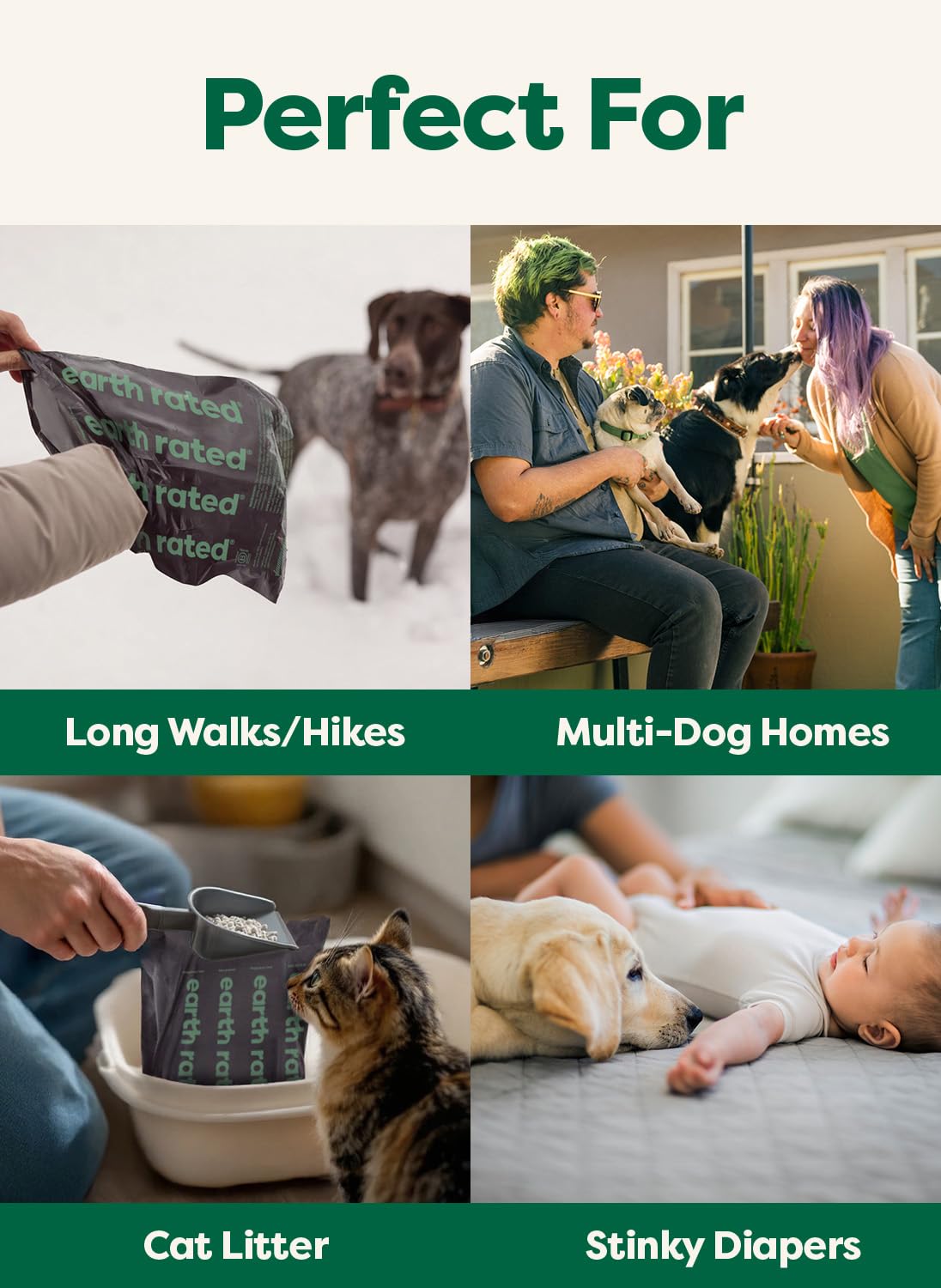 - DOG POOP BAGS: Our durable poop bags are a dog-walking essential. They are extremely portable and pair perfectly with the Earth Rated Poop Bag Dispenser for easy access while on the go.