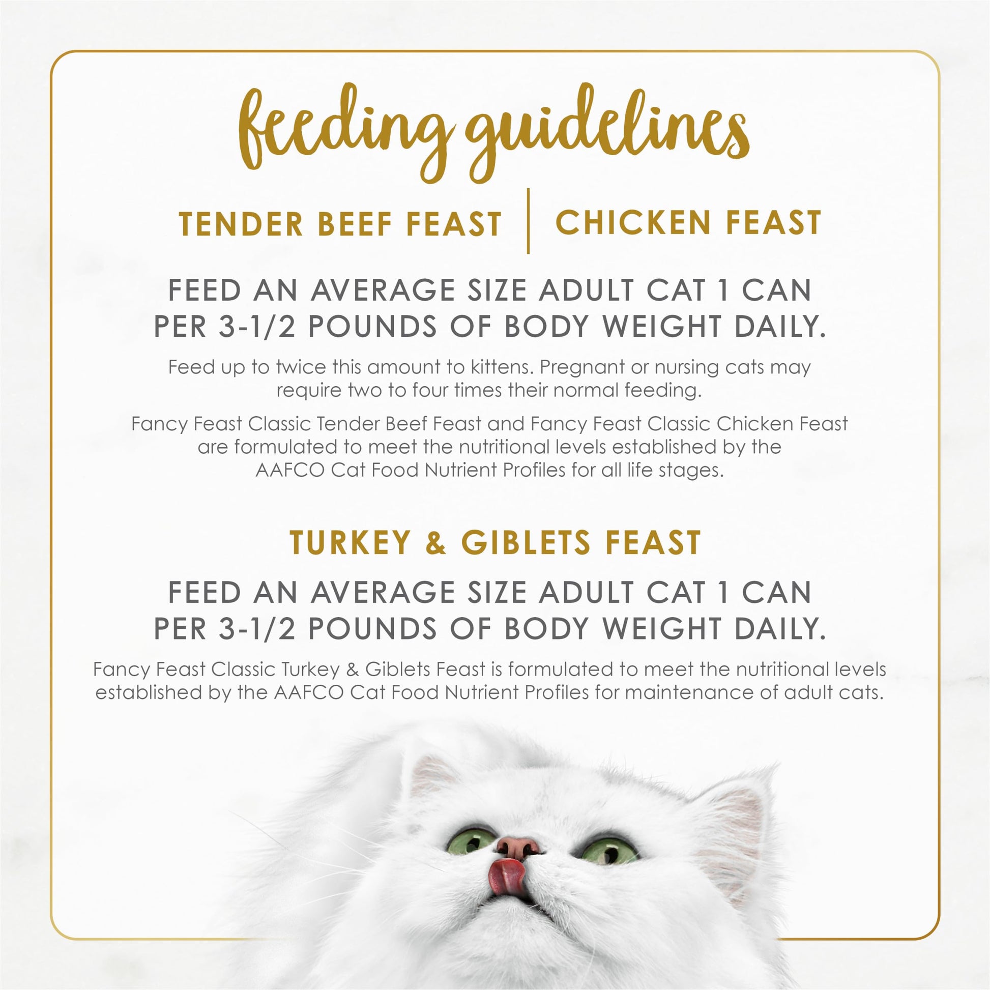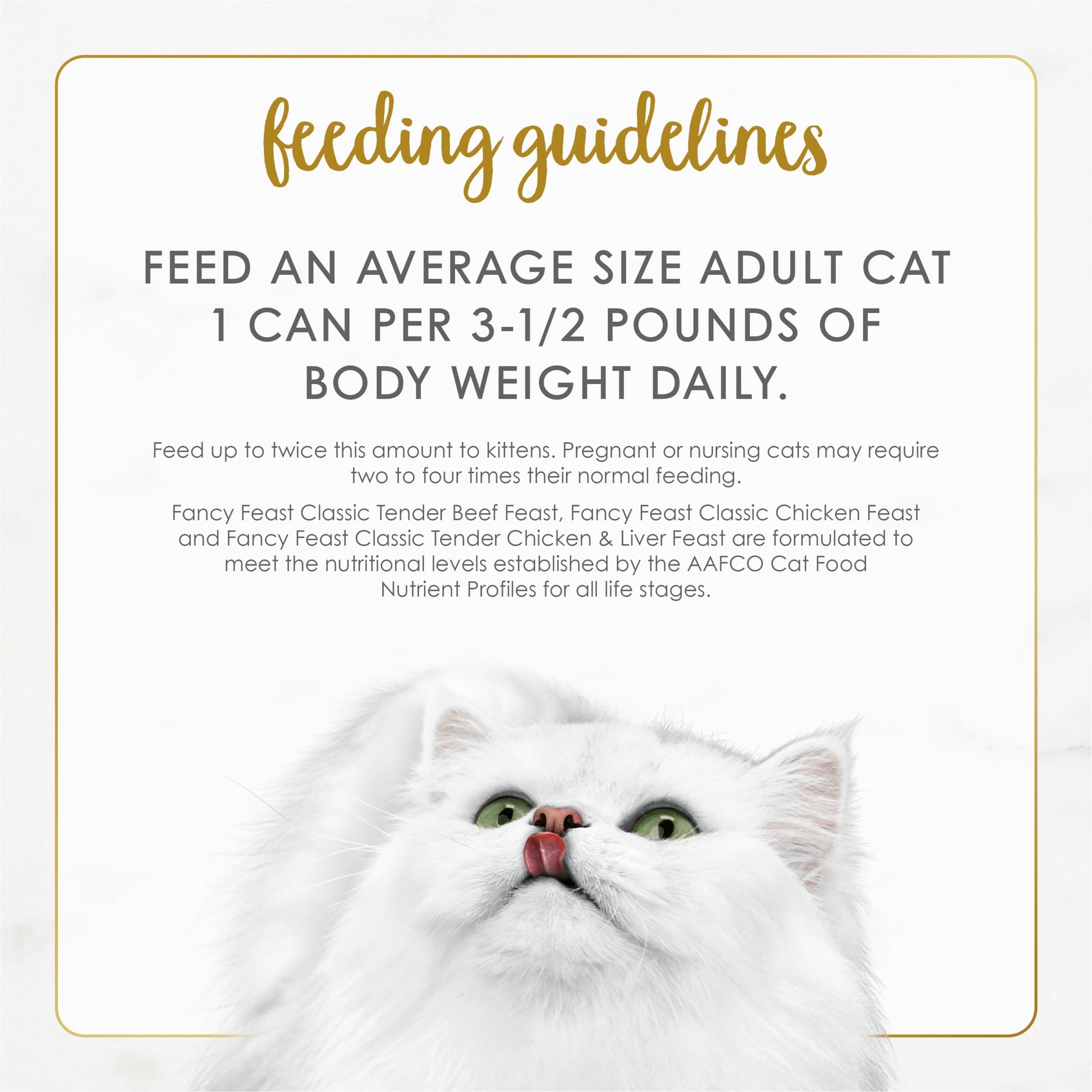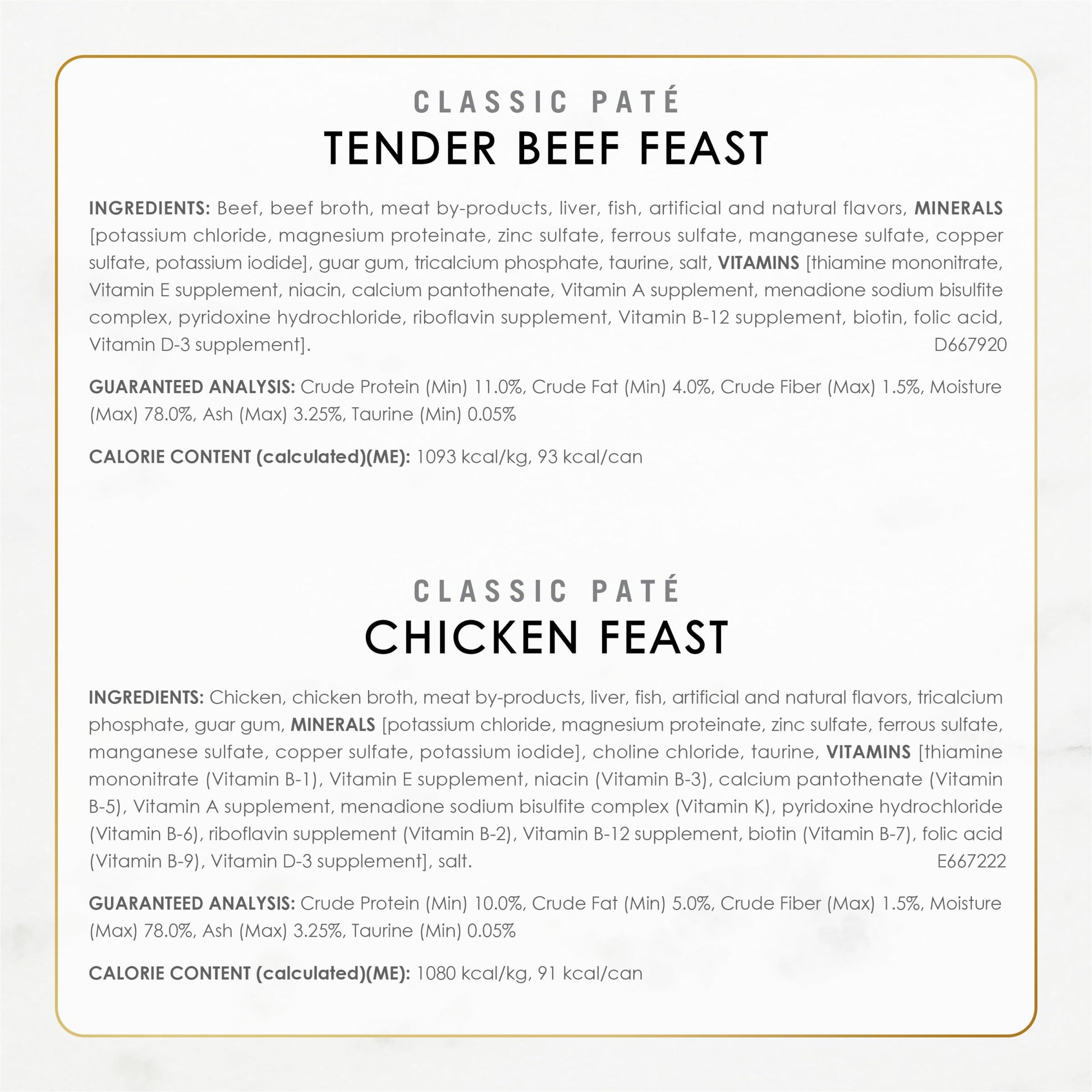 Bring home Purina Fancy Feast Classic Poultry and Beef Pate Collection adult wet cat food, and let your cat find her favorite gourmet flavors. This trio of classic flavors gives her the delightful textures and flavors she enjoys while providing the 100 percent complete and balanced nutrition your adult cat needs to help her enjoy a long and happy life. Tender pate tempts her to her dish each day, with its delightful texture and gourmet taste. With essential vitamins and minerals helping to care for her whole-body health, this collection of classic Fancy Feast recipes lets you feel good about indulging your favorite feline with gourmet wet cat food. Each delectable serving contained this Purina Fancy Feast wet cat food variety pack answers her desires with the flavors of poultry and beef in combinations that ensure a clean dish at the end of the day. Let your cat try this Purina Fancy Feast Collection today, and show her how much you care about her happiness.