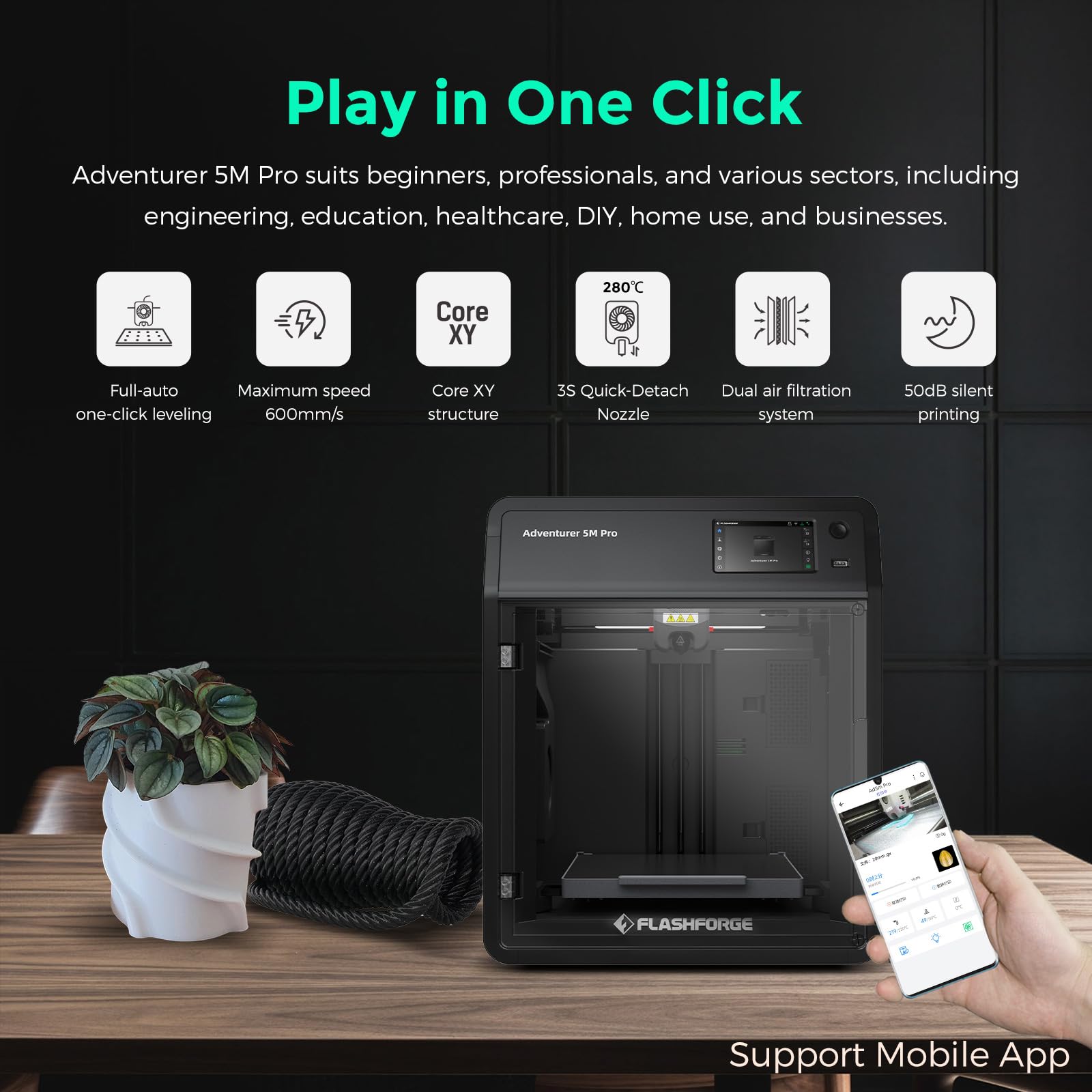 - User-Friendly Operation: Unbox to print in 10 mins. Integrated smart management via mobile app-Flash Maker includes remote video monitoring, real-time progress tracking, parameter adjustments, and alerts. Features like auto shutdown, resume printing, and filament detection optimize workflow. Dual circulation system reduces dust, ensuring a safer, more convenient experience, giving you full control with ease.