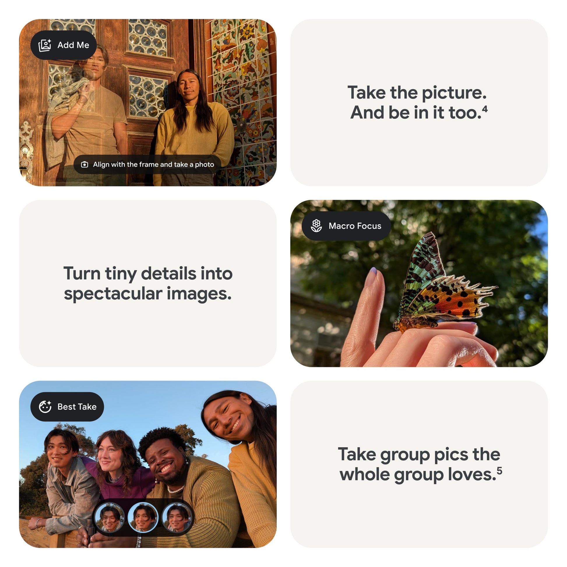 - Take amazing photos and videos with the Pixel Camera, and make them better than you can imagine with Google AI; get great group photos with Add Me and Best Take[4,5]; and use Macro Focus for spectacular images of tiny details like raindrops and flowers