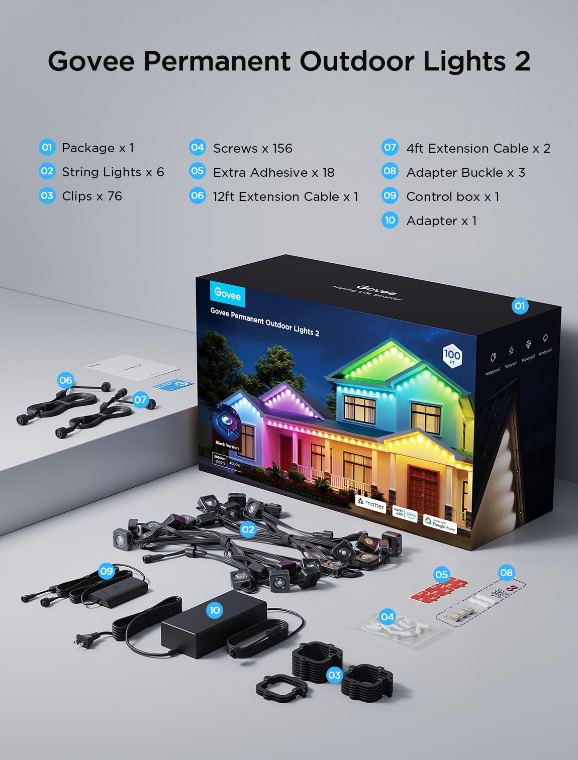 - Easy Installation: Provided VHB glue and clips make installation simple. Note: Govee Permanent Outdoor Lights 2 cannot be cut. Maximum of 9 light segments & 4 extension cables (2 × 12ft & 2 × 4ft).