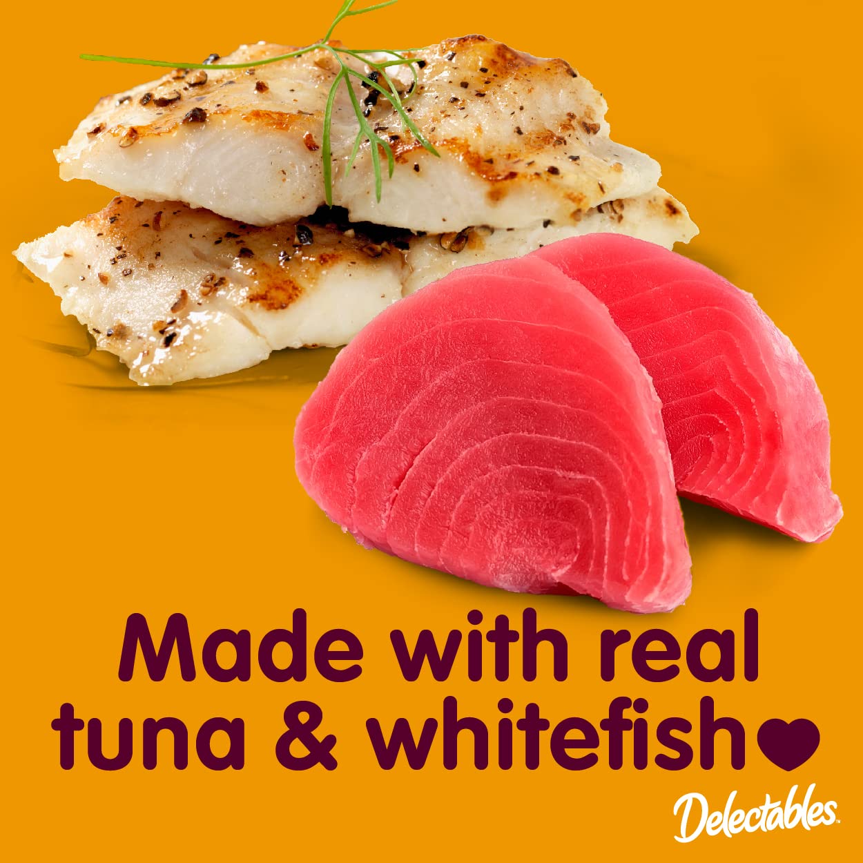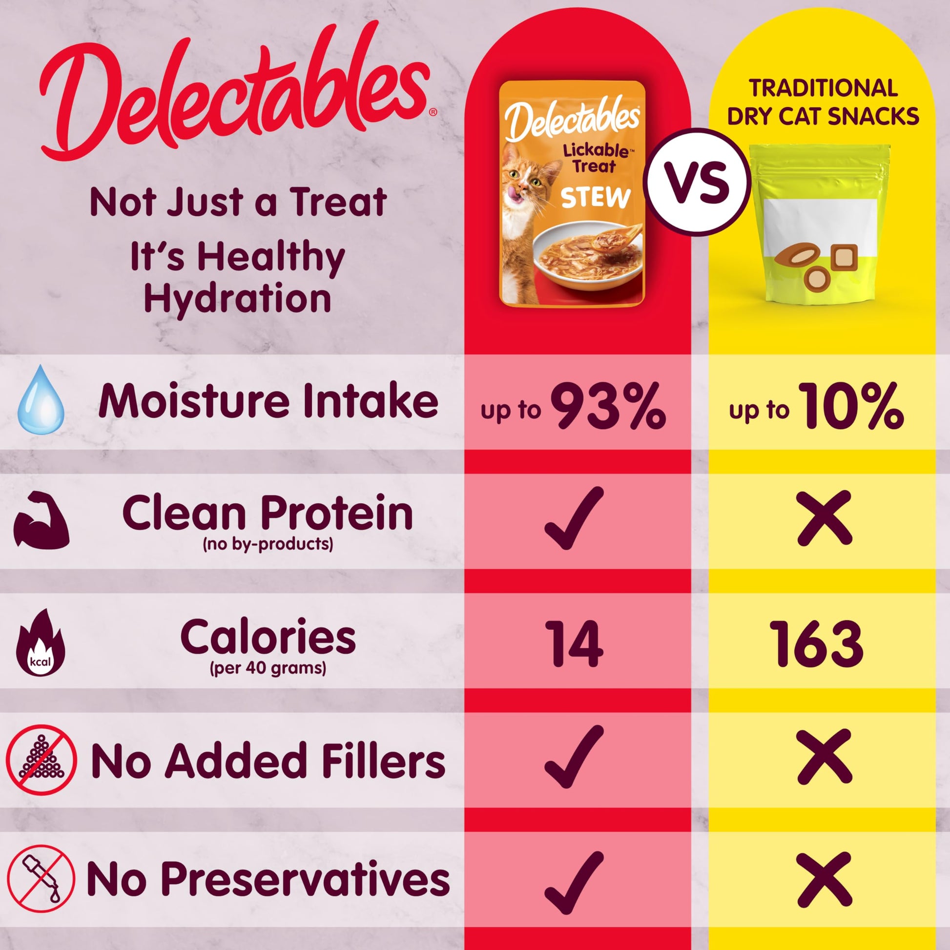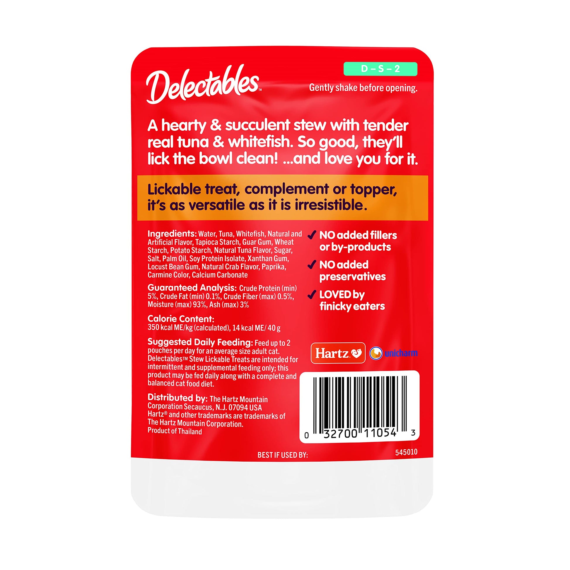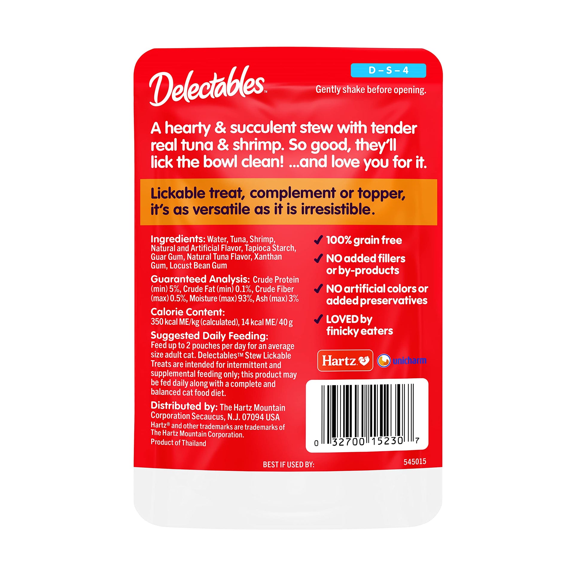 Delectables Lickable Treat Stew features a unique combination of real, tender ingredients in a hearty, succulent stew that'll have even the pickiest cats meowing for more! Crafted with premium wild-caught tuna, whitefish, shrimp and/or cage-free chicken, these treats offer a perfect mix of delicious nutrition and hydration boost. This innovative recipe perfectly blends the sauce and high-quality protein, so your cat can savor every delicious lick without leaving a drop behind. Serve these versatile treats as a tempting food topper, a quick snack, or a special reward. Delectables Lickable Treats are guaranteed to make your cat feel loved and satisfied.