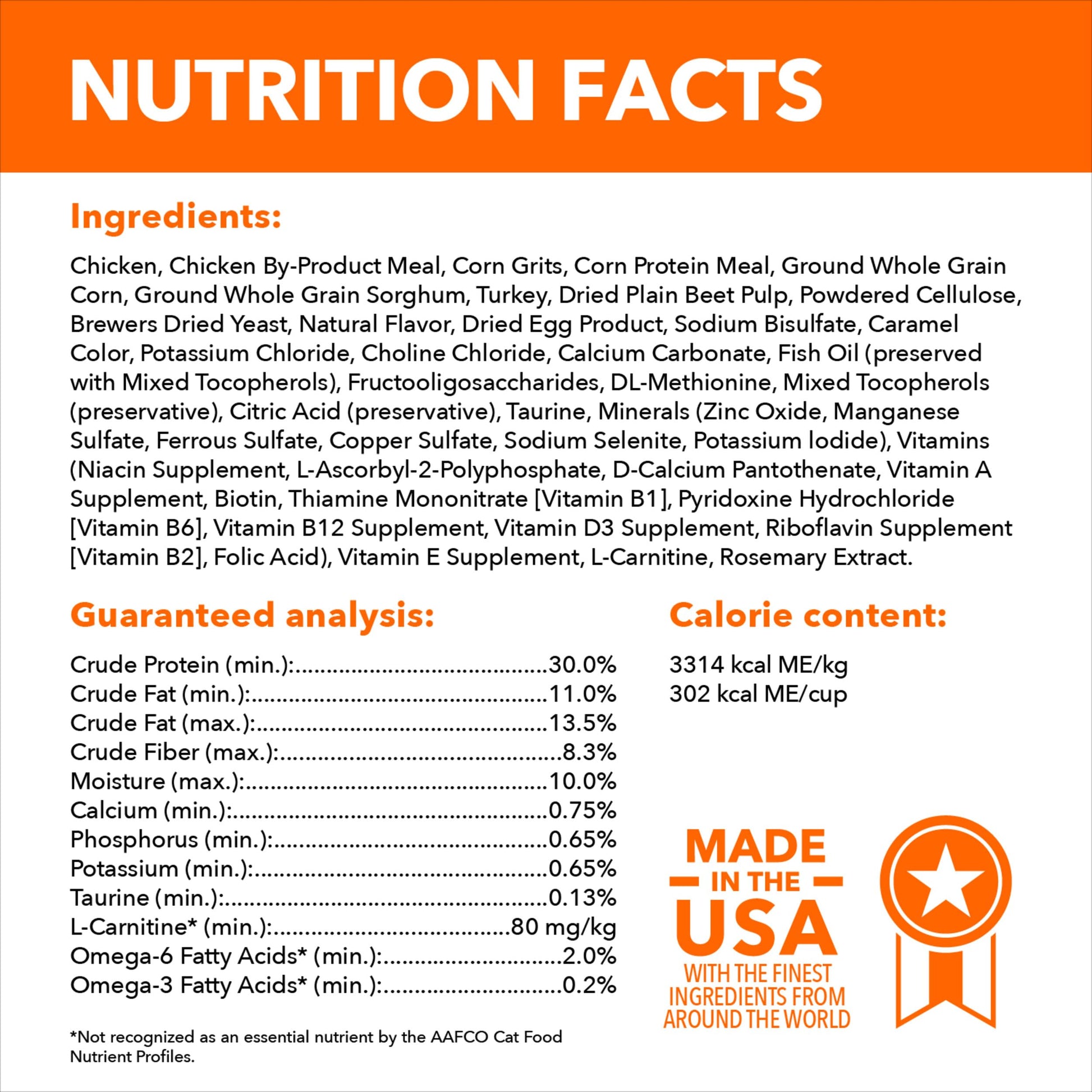 Crafted to support the optimal health of your indoor cat, IAMS Proactive Health Indoor Weight Control & Hairball Care Adult Dry Cat Food with Chicken & Turkey is an everyday meal that’s 100% complete and balanced. This wholesome, tasty cat food recipe is made with real chicken, turkey, and healthy ingredients that provide essential nutrients for your indoor cat. IAMS Proactive Health indoor cat food is formulated with a proprietary fiber blend with beet pulp that helps reduce hairballs before they start, making this the perfect hairball control cat food. To further support your indoor cat’s health, this kibble is specifically formulated with L-carnitine to help burn fat and maintain a healthy metabolism. Flavorful, nutrient-rich, and formulated for every stage of life, it’s no wonder veterinarians recommend IAMS cat food. Help keep your cat healthy, happy, and playful for life with tailored nutrition from IAMS cat food.