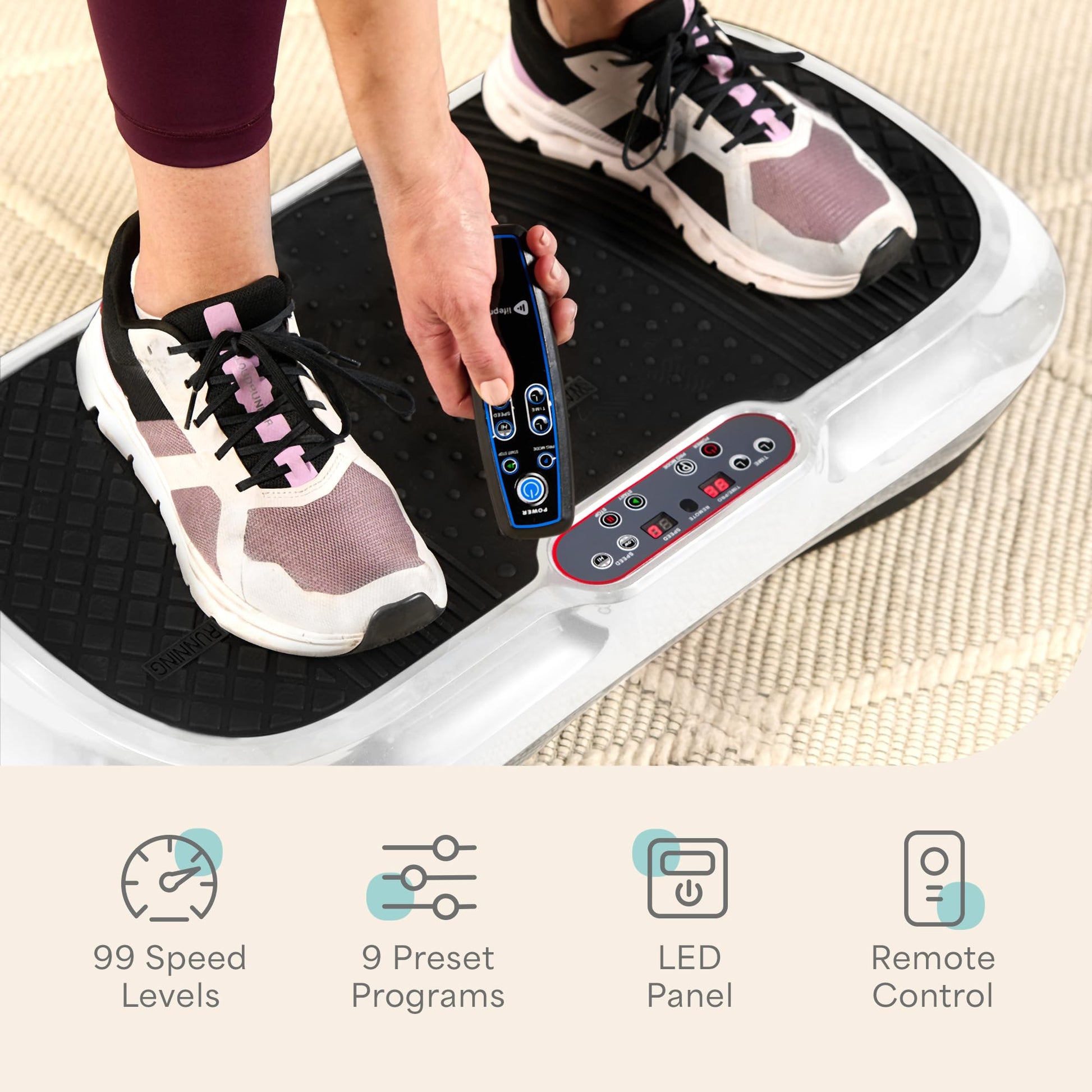 - Powerful and Customizable - Easily switch between 99 speed settings to maximize your workouts. The vibration board exercise machine features anti-slip rubber, a user-friendly display, and whisper-quiet vibrations for maximum convenience.