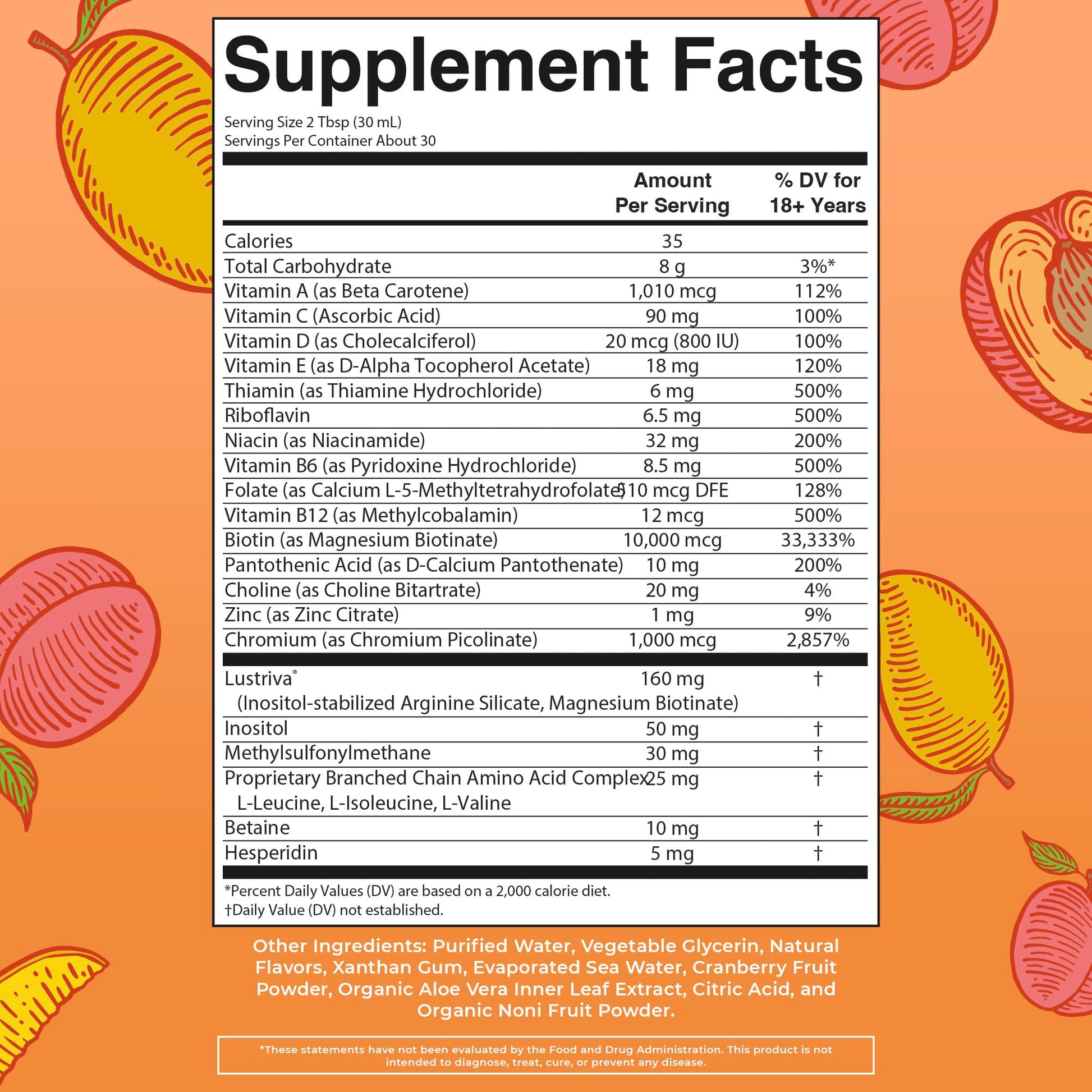 - WOMEN HAIR GROWTH SUPPLEMENT: Enjoy this delicious liquid multivitamin in a peach mango or dragon fruit melon flavor and receive all of these nutrients plus Lustriva for thicker, fuller hair in women with just two tablespoons per day!