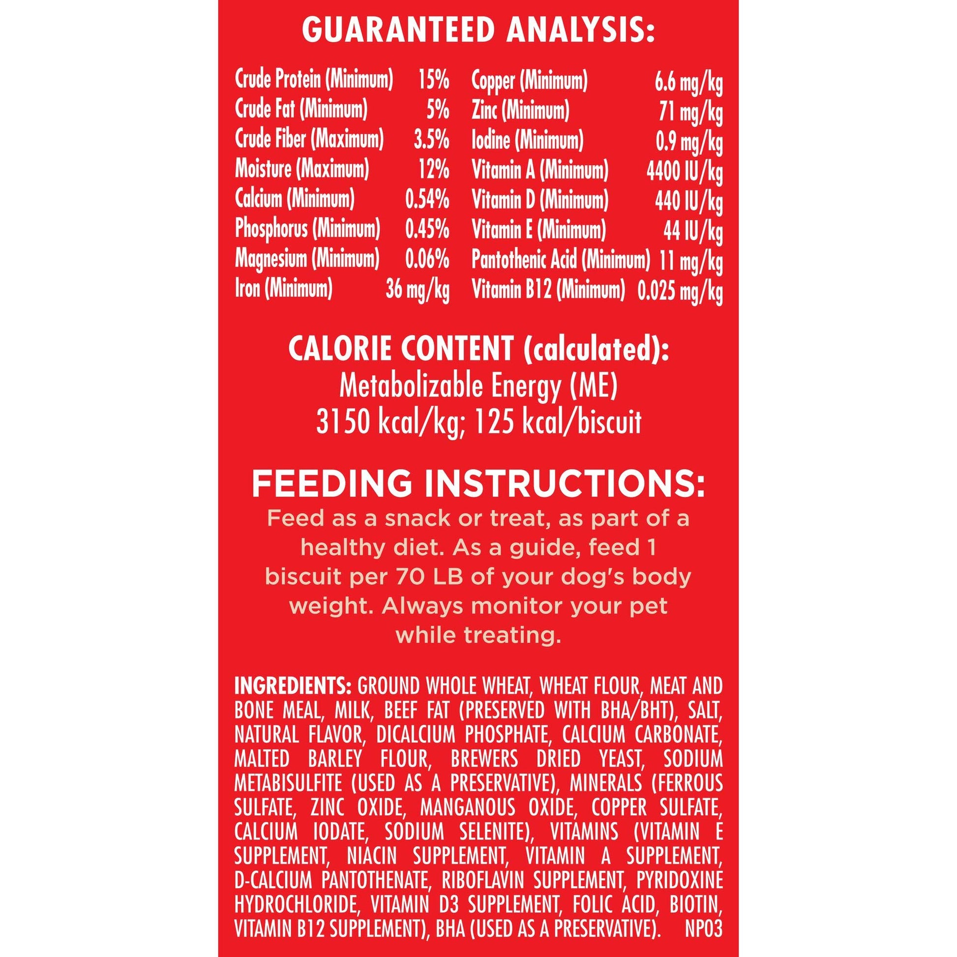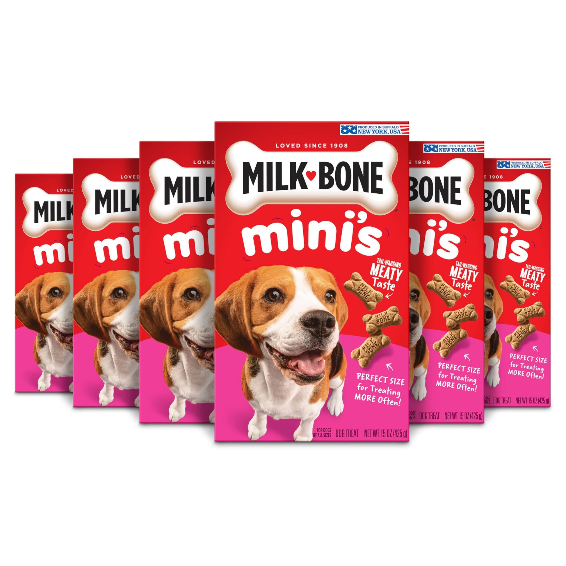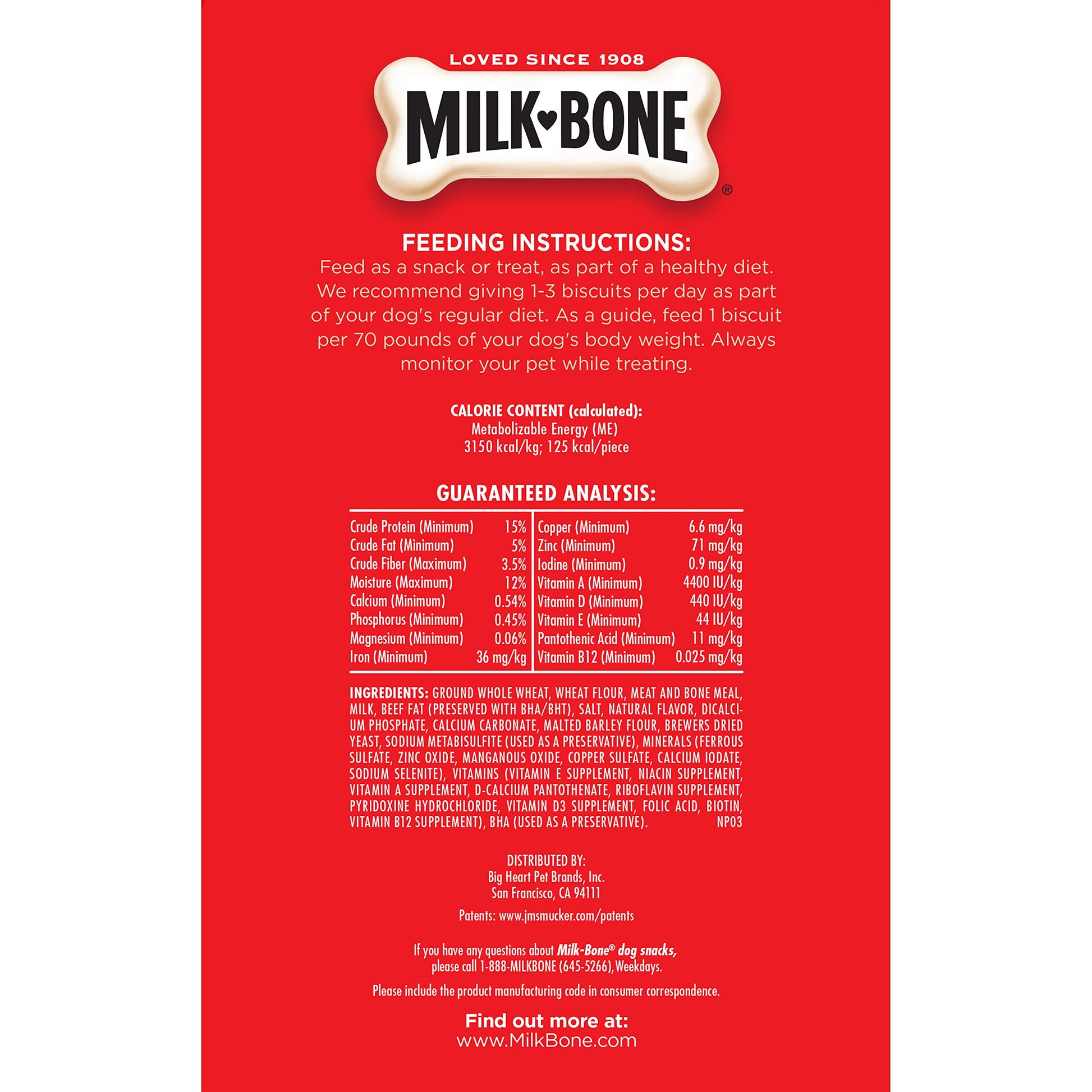 Give your dog tasty fun every day with Milk-Bone Original Dog Biscuits. These medium dog treats deliver that irresistible, classic crunch and tail-wagging meaty taste dogs can’t get enough of in every bite. But the great taste isn’t the only thing to love about these dog snacks. Their crunchy texture helps clean teeth and reduce tartar build-up to make those sloppy doggy kisses even more enjoyable. Plus, they’re made with more than 12 vitamins and minerals, and they’re produced in Buffalo, New York, USA. Add a box to your cart, and fill every day of doglife with more love (and deliciousness).