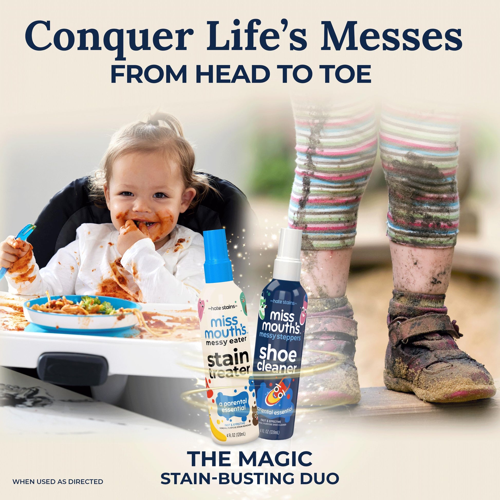 - EASY TO USE: First, ditch the excess gunk and dampen dry stains with a splash of water. Spray on Miss Mouth’s, give it a little rub if needed, then toss it in the wash or clean as usual. Still see the stain? Hit repeat. Easy peasy.