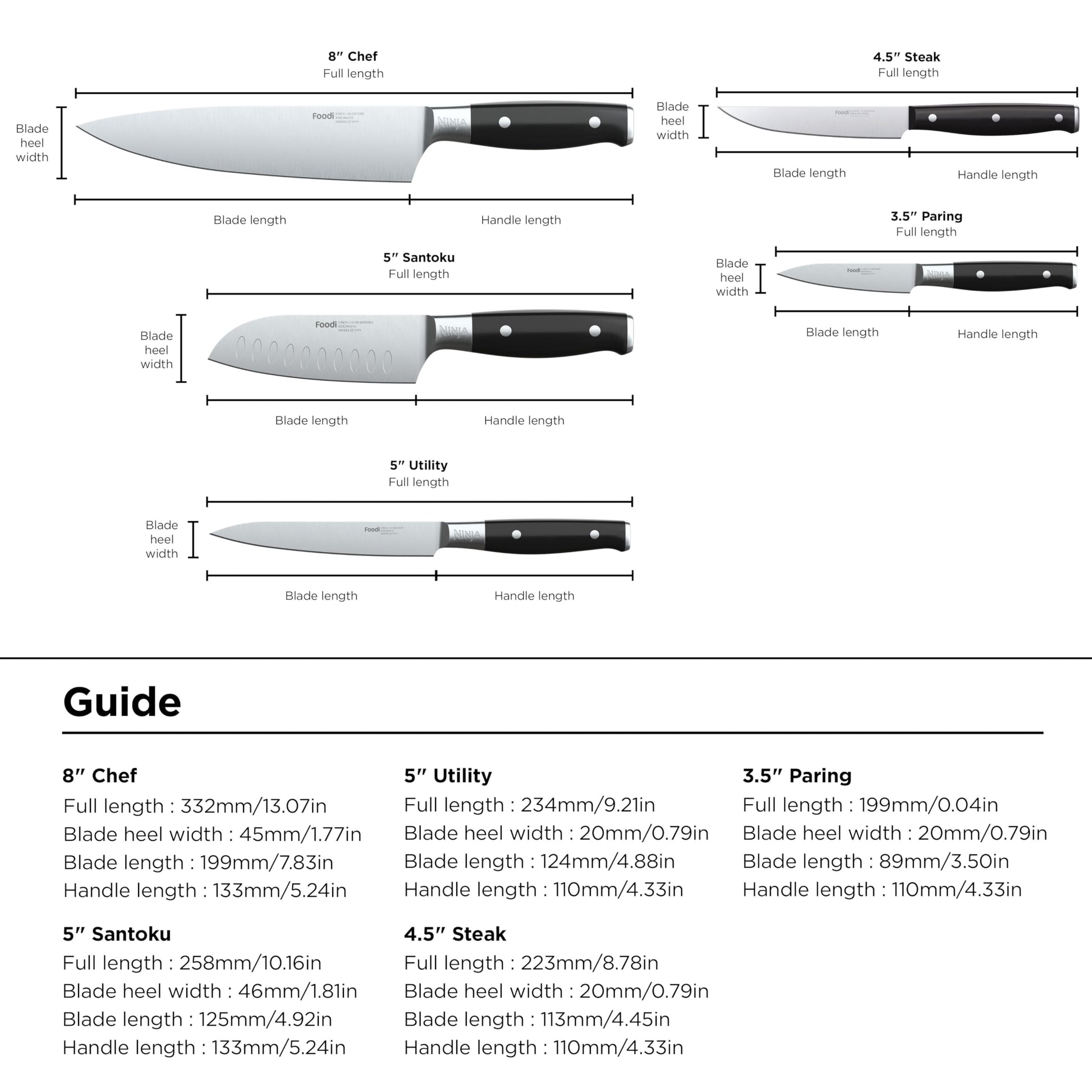 - WHAT'S INCLUDED: 14 piece set includes 8" Chef knife, 8” Bread knife, 5" Santoku knife, 5” Boning knife, 5" Utility knife, 3.5" Paring knife, (x6) Steak knives, Shears, Knife block with NeverDull Technology.