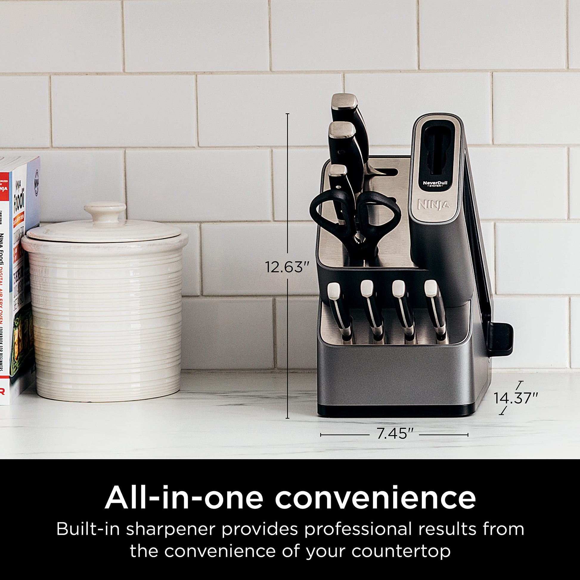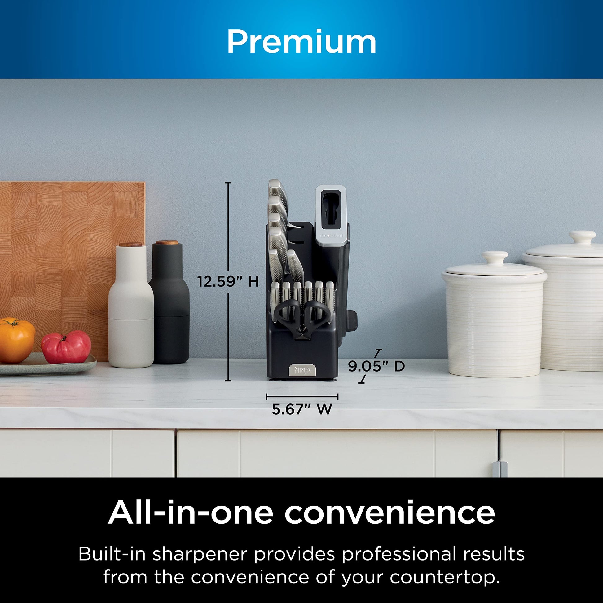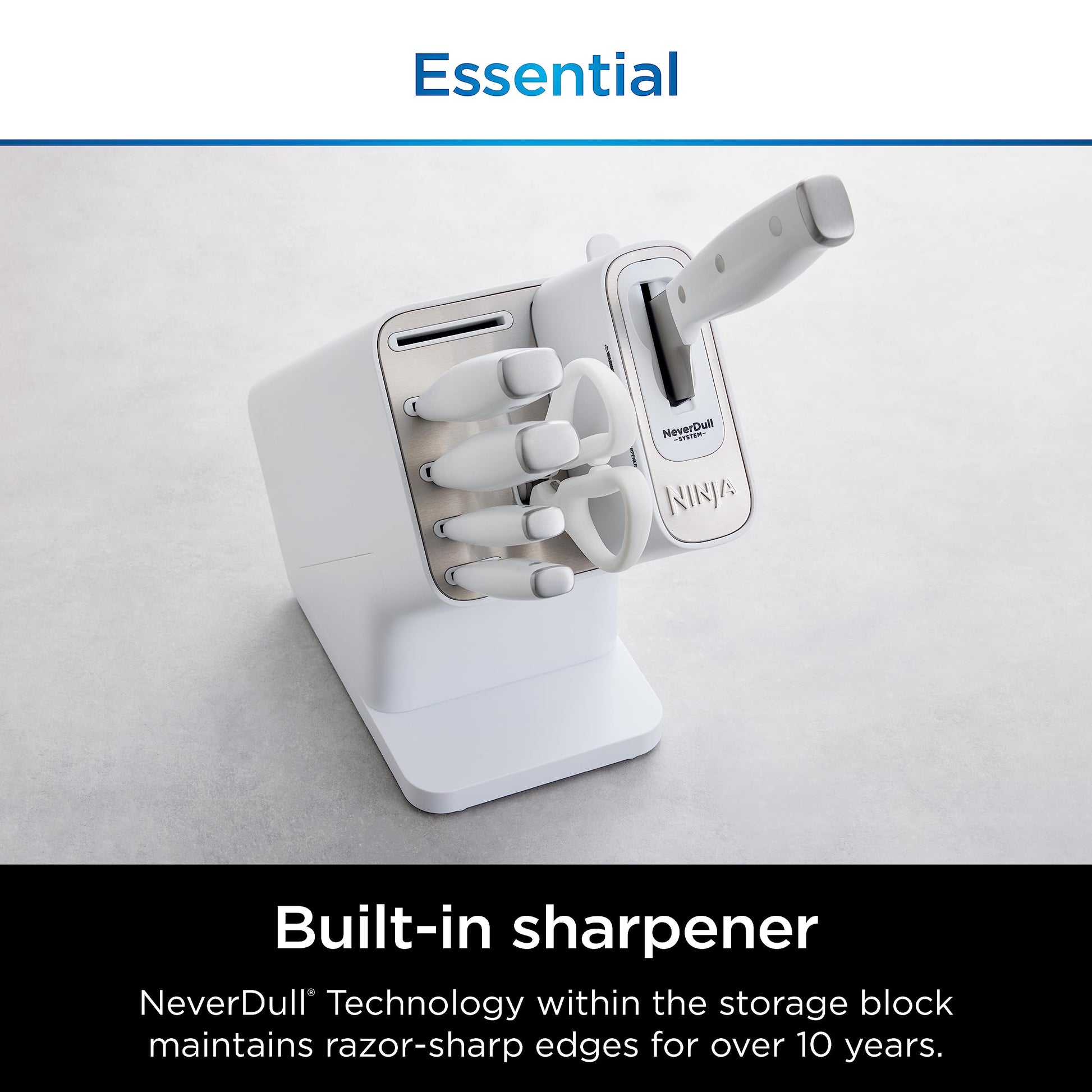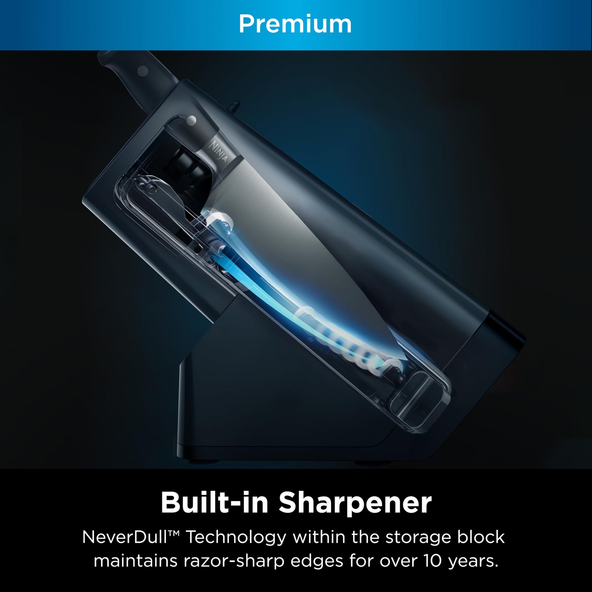 - BUILT IN SHARPENER: NeverDull Technology is conveniently built into the storage block for professional sharpening results that will maintain a razor sharp edge for over 10 years