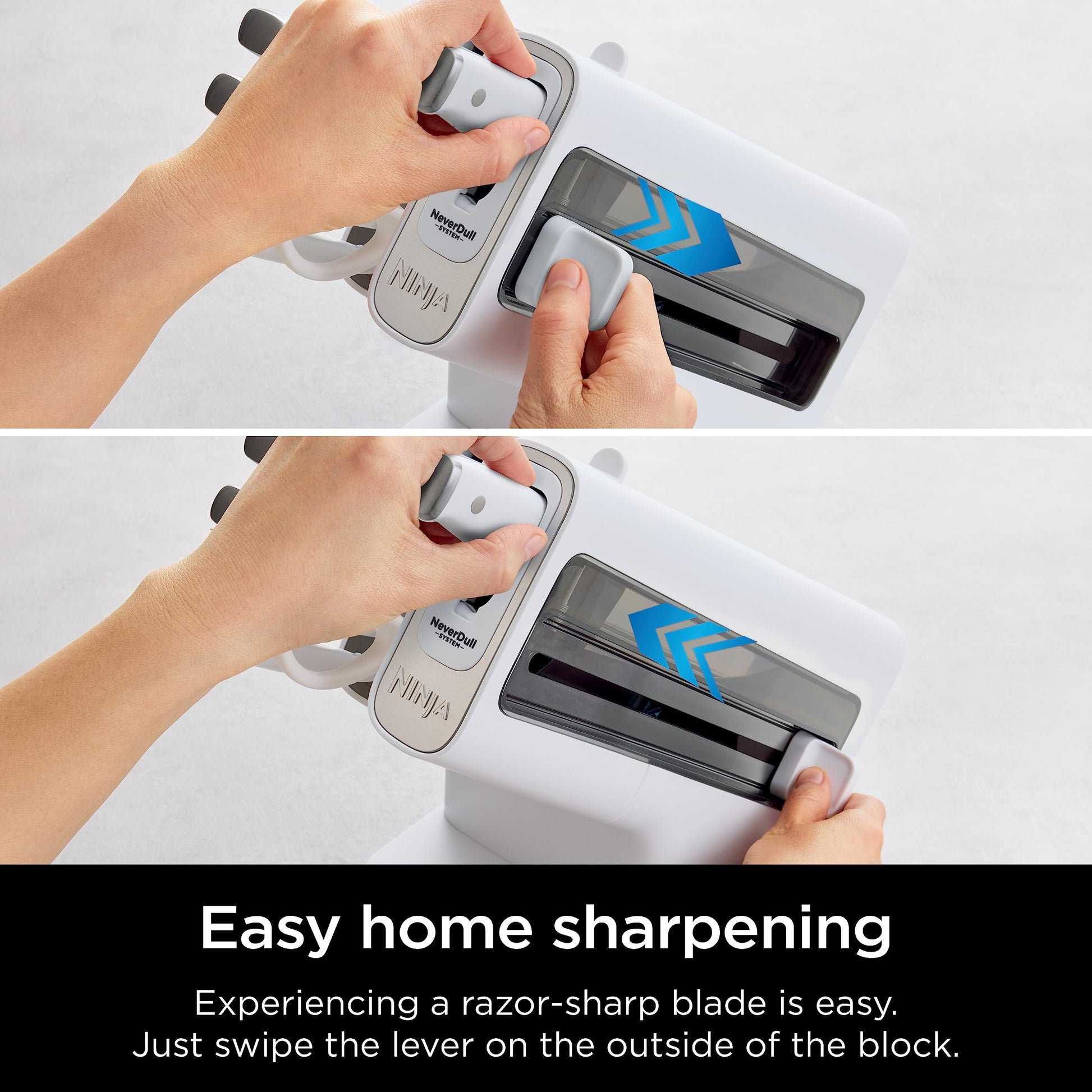 - EASY HOME SHARPENING: Easy, foolproof sharpening ensures you’ll never experience the frustration of a dull knife again. All you do is swipe the lever on the outside of the block.