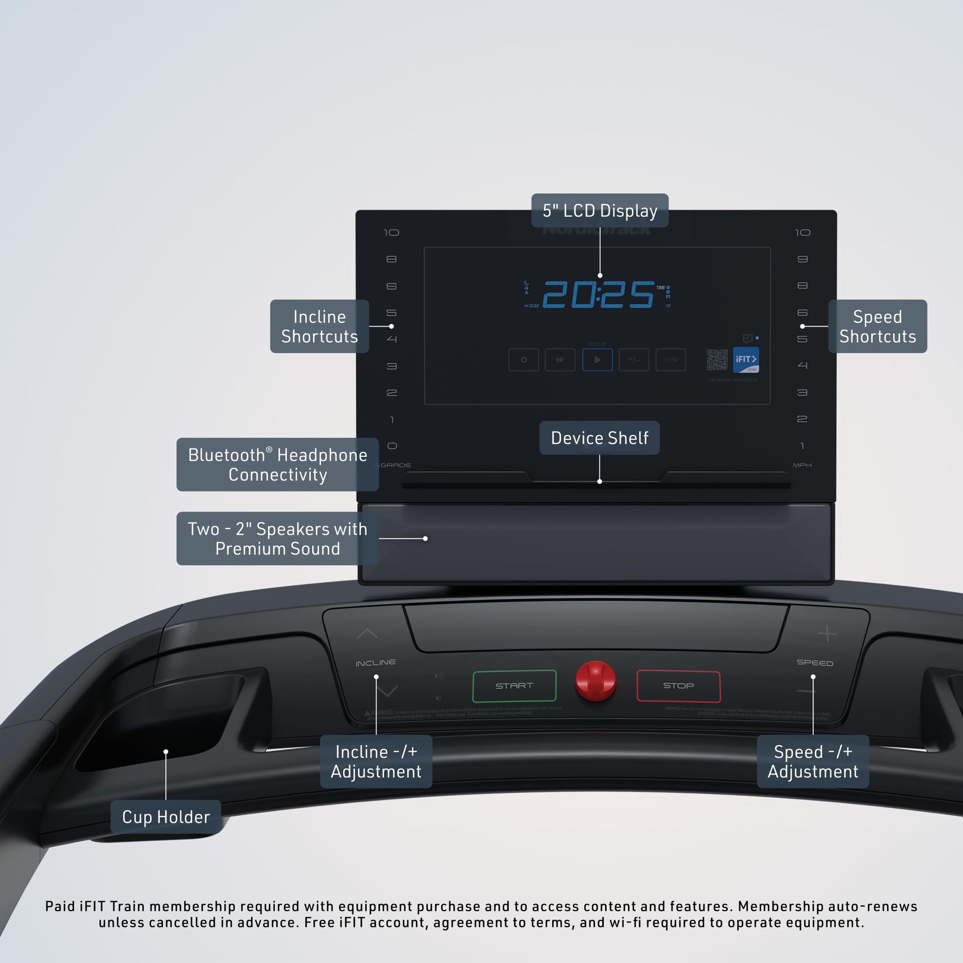 - [5" LCD Display & Device Shelf] - See your live workout stats on the clear 5” LCD display or use your own device to follow iFIT trainers and automatically control your treadmill, all from your phone or tablet. (Train Membership Required)