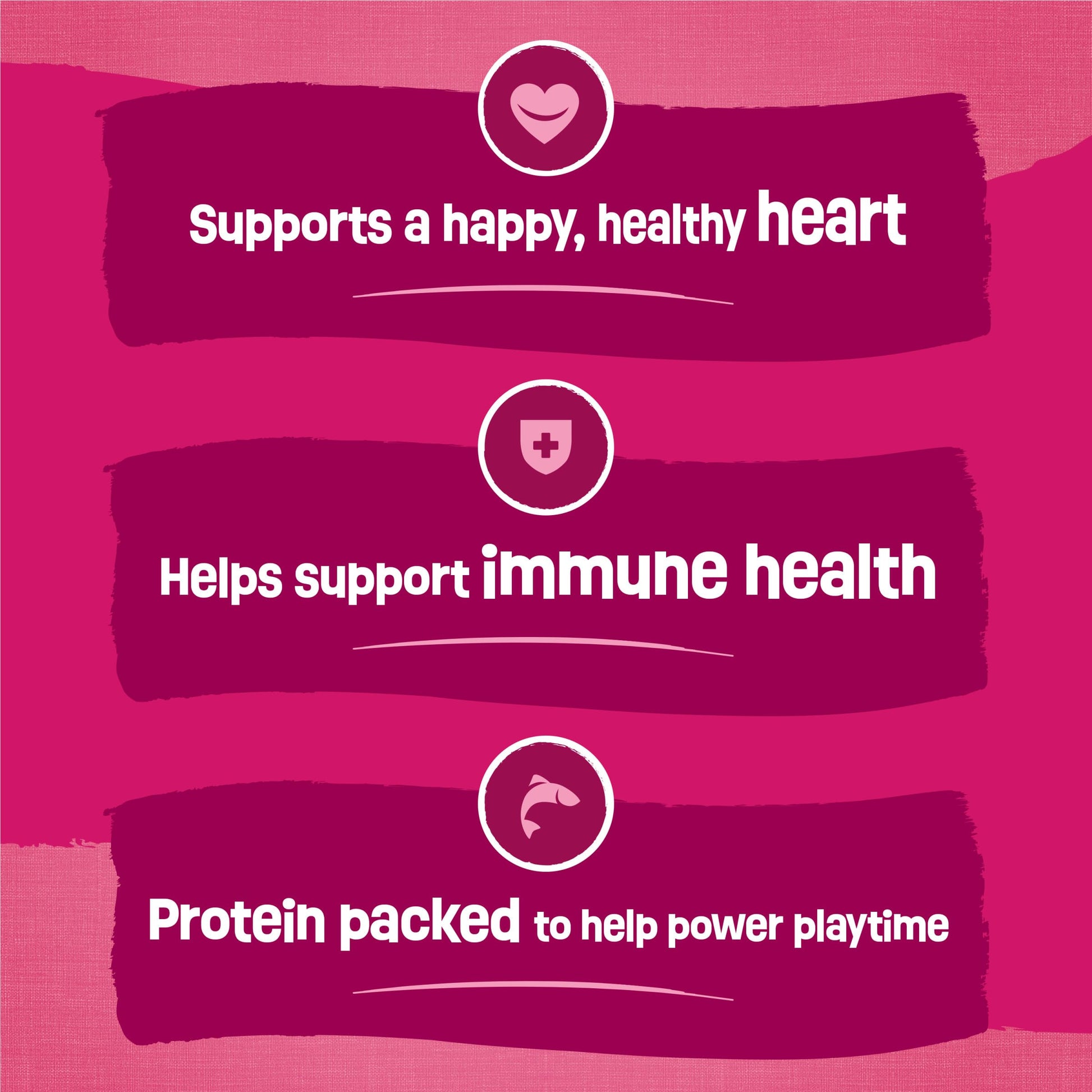 Bring the deliciousness of gravy mixed with two cat-favorite flavors to your cat's dish with Purina Friskies Gravy Swirlers dry cat food. Savory chicken and salmon flavors combine to create the taste cats crave, and there's gravy baked into each bite for added yum. Let the sound of the mouthwatering kibble hitting her bowl pique your cat's attention, and watch as she delights in every last delicious bite. This dry cat food recipe features essential vitamins and minerals for the everyday nutrition your cat needs to be her best self. Because it's formulated for all life stages, this mouthwatering meal can follow your cat companion from her playful kitten days all the way through to her adventurous adult years. Give your cat the 100 percent complete and balanced nutrition she deserves along with the taste she adores every time you offer up a helping of this Purina dry cat food. Fill your cart with Purina Friskies Gravy Swirlers to be one step closer to filling her dish with a taste she loves.