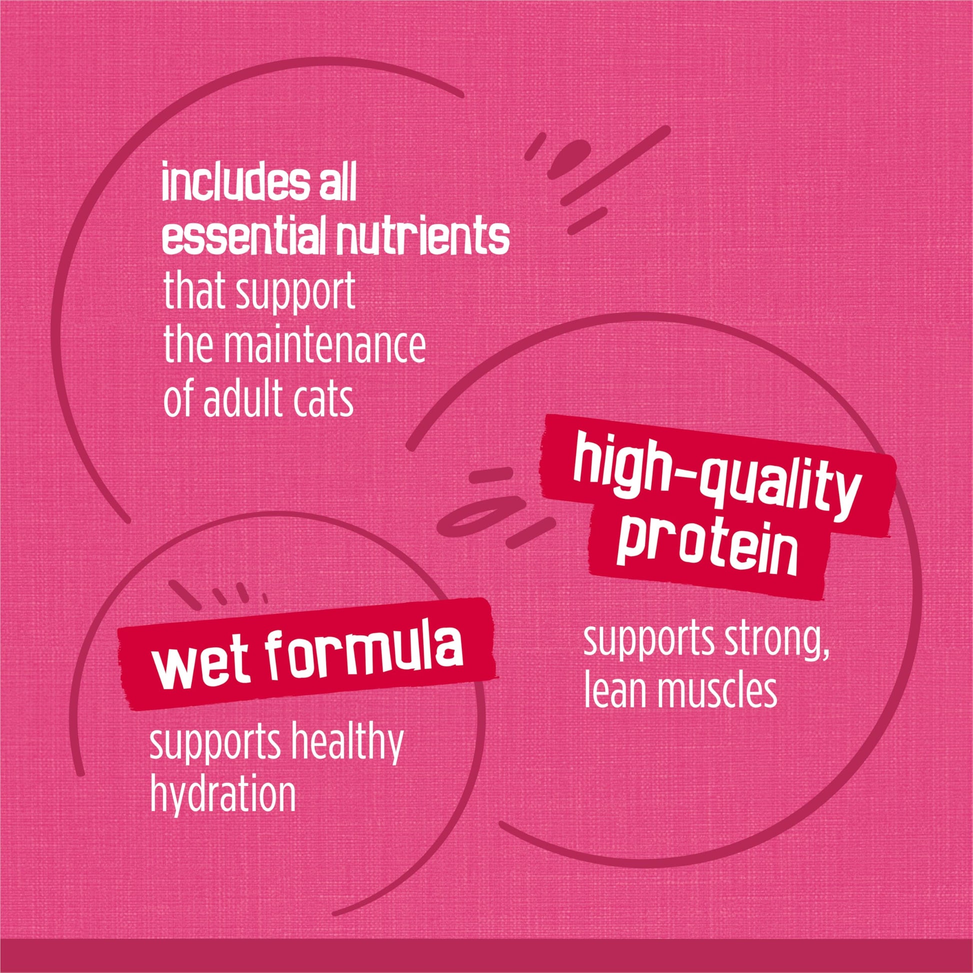 - Shredded soft cat food chunks offer a tempting texture. Provides 100 percent complete and balanced nutrition for adult cats