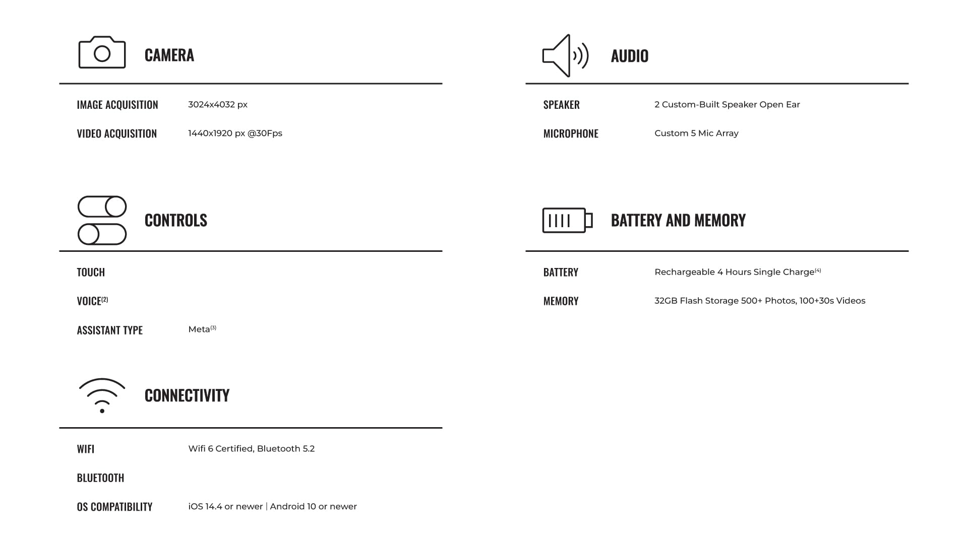 - GET REAL-TIME ANSWERS FROM META AI — The Meta AI* built into Ray-Ban Meta’s wearable technology helps you flow through your day. When activated, it can analyze your surroundings and provide context-rich suggestions - all from your smart AI glasses.