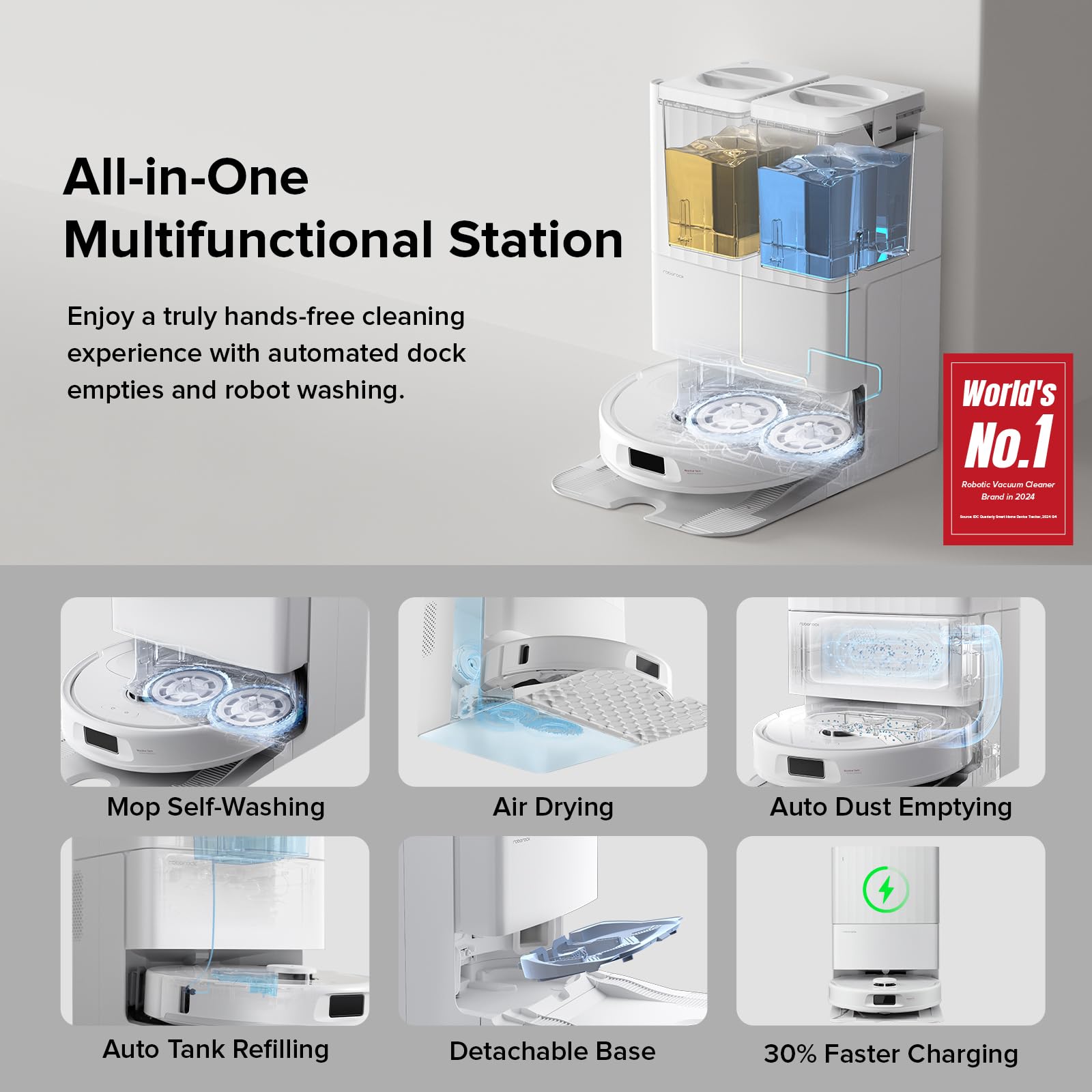 - All-in-One Docking Station: Designed for ultimate convenience, the advanced docking station automatically empties dust into a sealed 2.7L bag that lasts 7–9 weeks, refills the water with a 4L tank for 3552 sqft coverage, thoroughly washes mopping pads and dries them, ensuring the robot vacuum and mop always ready for the next cleaning. To maintain optimal operation, the dirty water tank should be cleaned regularly.