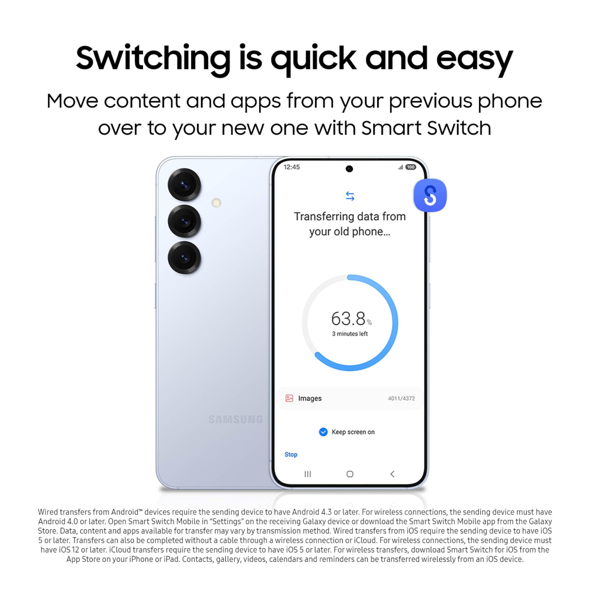 - SWITCHING IS QUICK & EASY: With Smart Switch, you can move your pics, videos, music, apps, contacts and convos to their new home, safely and securely, in just a few simple steps.