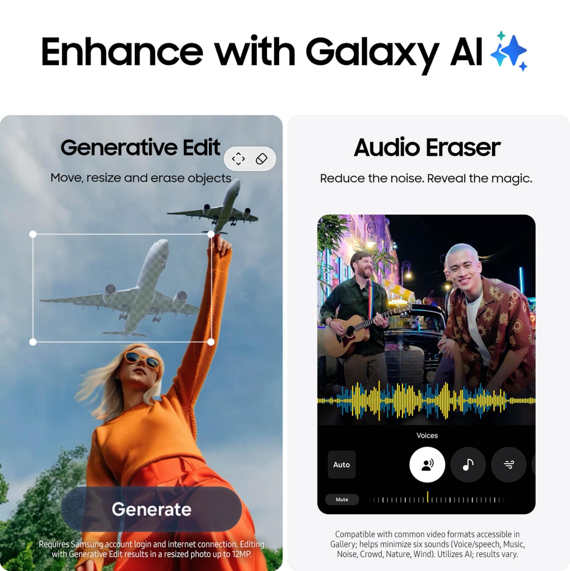 - REDUCE THE NOISE. REVEAL THE MAGIC: AI Camera with Audio Eraser lets you capture vibrant videos in low light and minimize unwanted noises so you can relive your favorite moments with fewer distractions.³