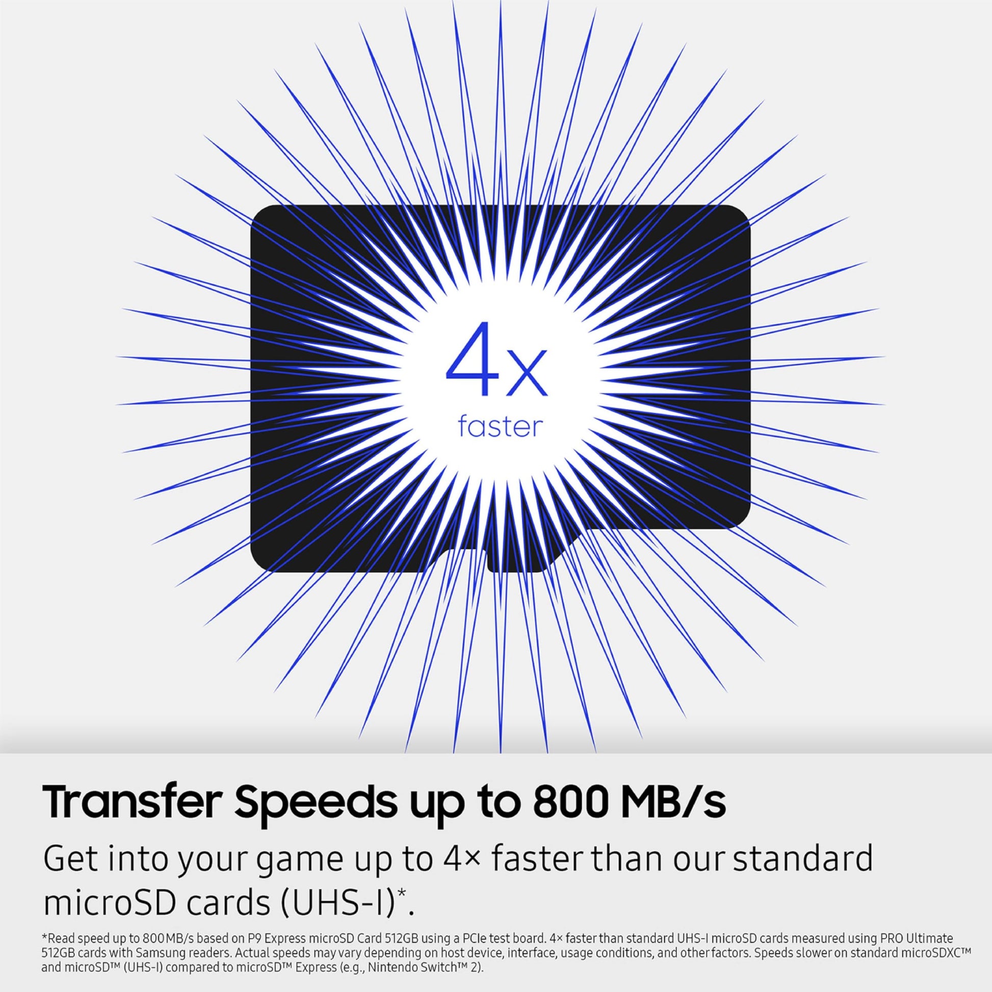 ¹Read speed up to 800 MB/s based on P9 Express microSD Card 512GB using a PCIe test board. 4x faster than standard UHS-I microSD cards measured using PRO Ultimate 512GB cards with Samsung readers. Actual speeds may vary depending on host device, interface, usage conditions, and other factors. Speeds slower on standard microSDXC™ and microSD™ (UHS-I) compared to microSD™ Express (e.g., Nintendo Switch 2™).
