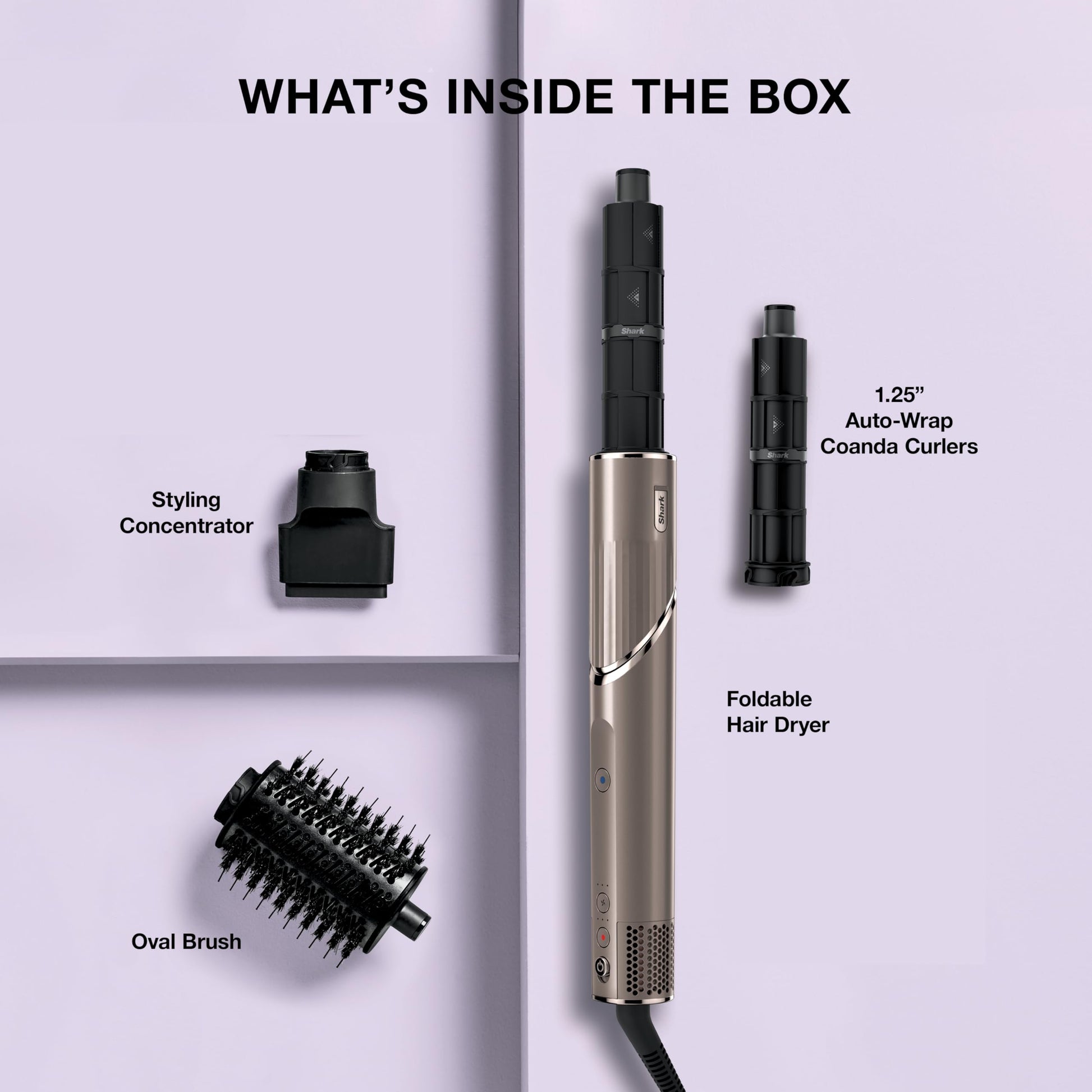 - What's Included: Shark FlexStyle Styling Concentrator, 1.25" Auto-Wrap Curlers, Oval Brush, Paddle Brush, FrizzFighter Finishing Tool, Curl-Defining Diffuser, and Hard Case