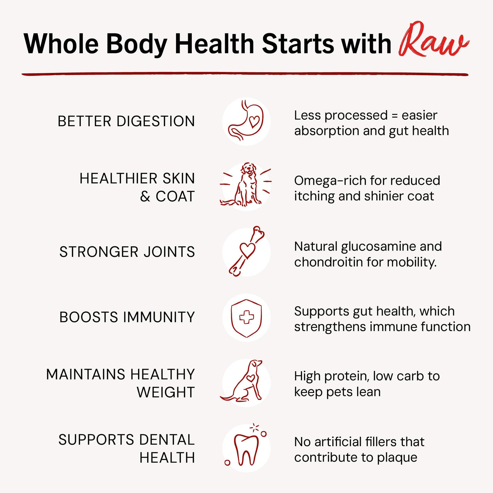 Perfect for puppies and adult dogs alike, our versatile patties can be served as complete meals, crumbled as nutritious food toppers, or broken into high-value training treats. For sensitive stomachs, our grain-free, probiotic-enhanced formula improves digestion while omega fatty acids promote healthier skin and coat.