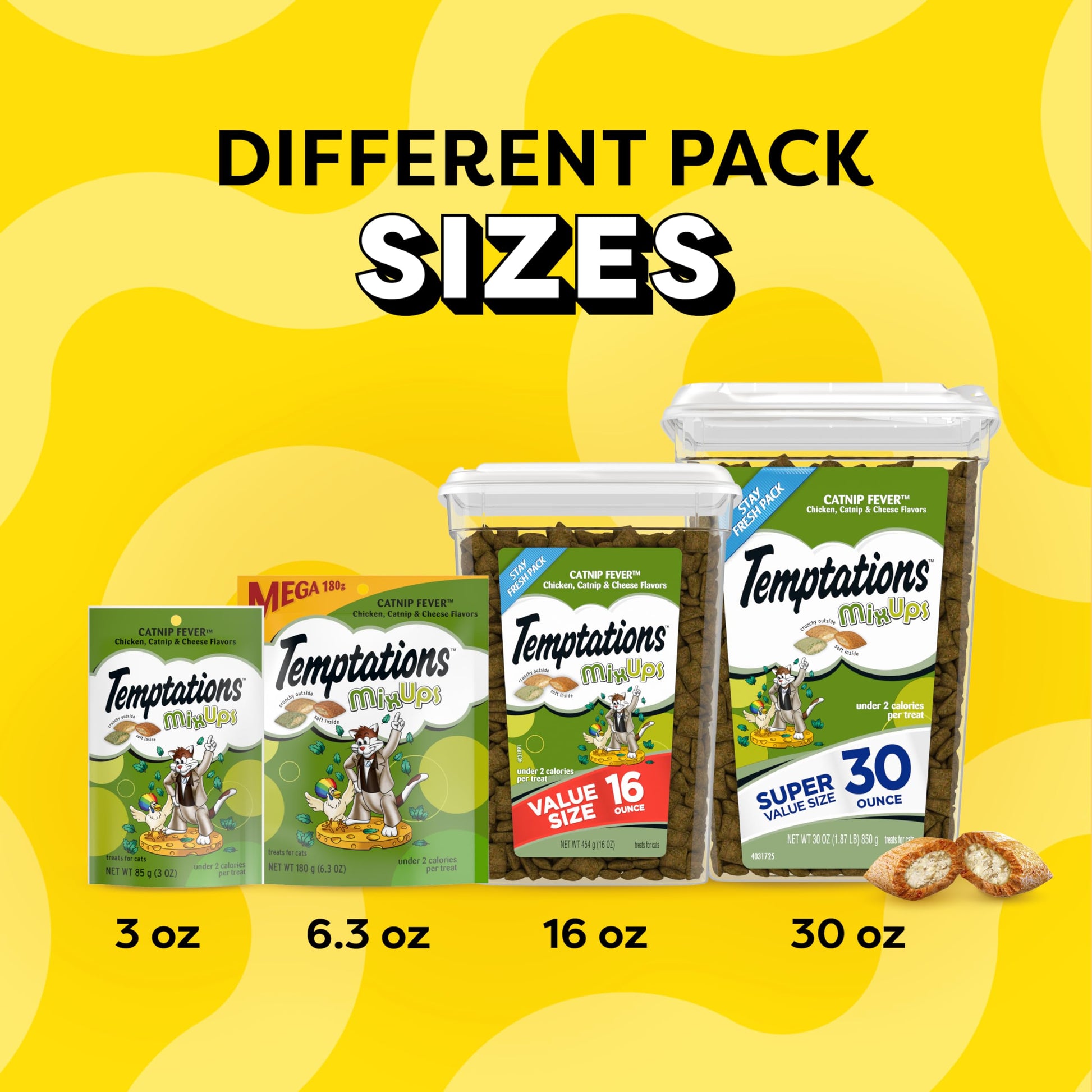 Did your fussy feline greet you with a chorus of purrs when you got home? Reward your cat with a mix-n-match of their favorite playtime cat treats. Temptations MixUps Catnip Fever is a trifecta of tempting treats with a mix of chicken, catnip, and cheese flavors. Each of these tasty cat treats has less than 2 calories and provides an irresistible combination of both crunchy and soft textures. They're excellent-sized treats for cat toys, so try placing a few inside a treat dispenser toy and watch your furball chase and swat away. Temptations MixUps comes in a resealable, Super Value-sized tub, so your fur-friend can enjoy their favorite cat treats when you open it… but not when they shouldn’t! Temptations MixUps are the purr-fect crunchy and soft cat snack to show your feline friend how much you care.