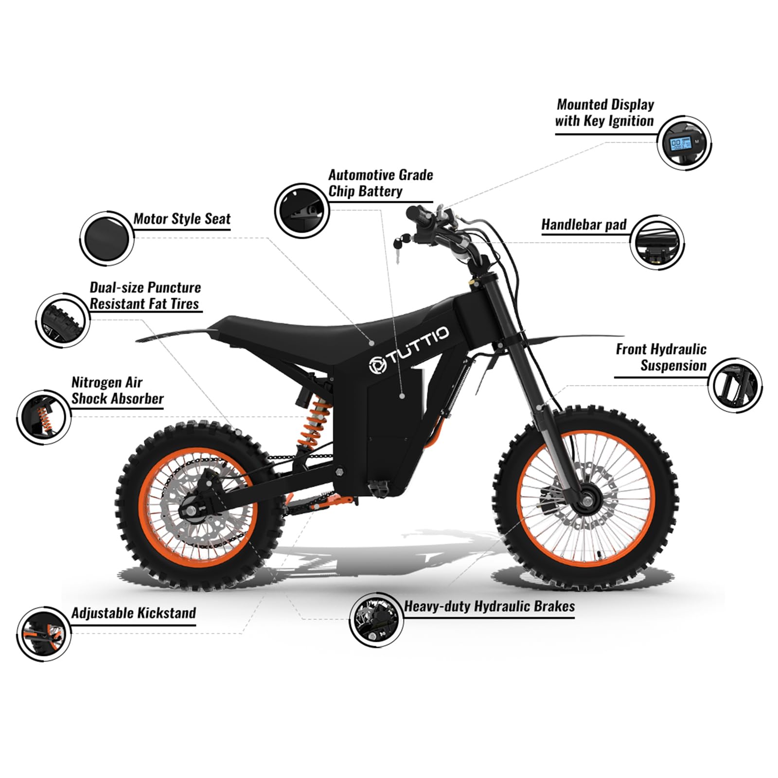 - 2000W Brushless Motor Powerful Electric Dirt Bike - This tuttio electric dirt bike is equipped with a powerful 2000W motor, which can continuously provide power of 34mph, provide you conquer challenging terrains and experience breathtaking acceleration like never before.