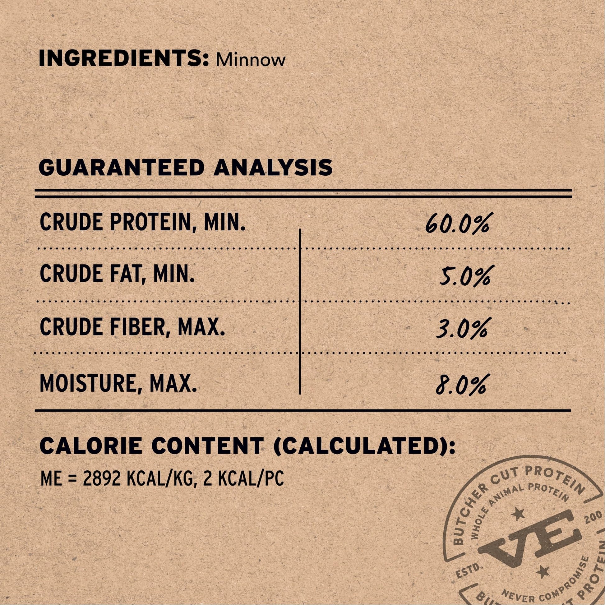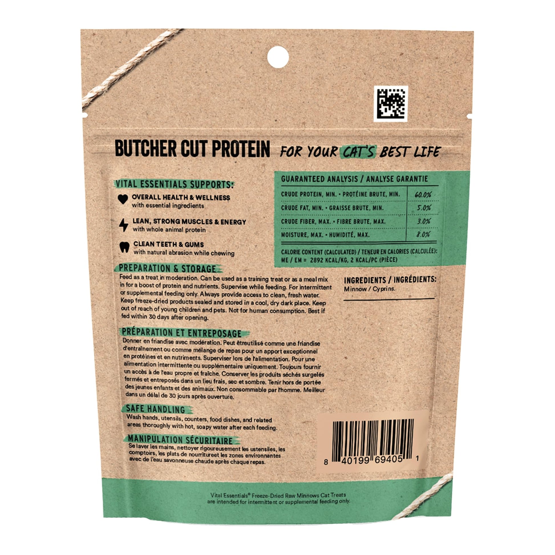 - FREEZE-DRIED RAW MINNOWS CAT TREAT: Vital Essentials Freeze Dried Cat Treats pack more protein than industry standard into every bite to deliver the peak vitality your dog deserves. Our natural freeze-dried raw cat treats are made from responsibly sourced premium minnows.