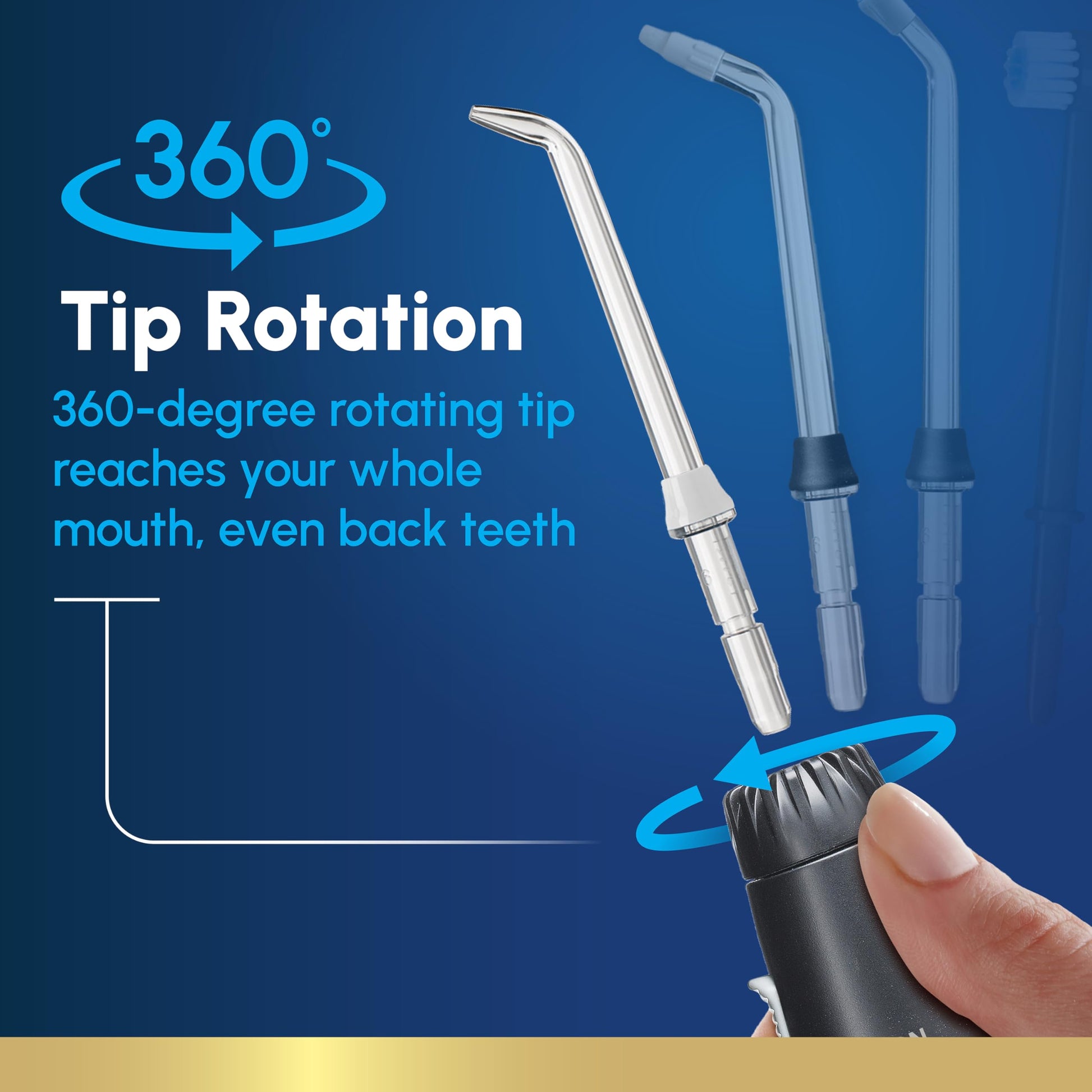 - KEY FEATURES: 7 tips for multiple family members and needs, 10 safe and effective pressure settings, removable 22 oz reservoir (top-rack dishwasher safe for easy cleaning), 90+ secs floss time, 360 tip rotation, 120VAC/60Hz for use in North America only