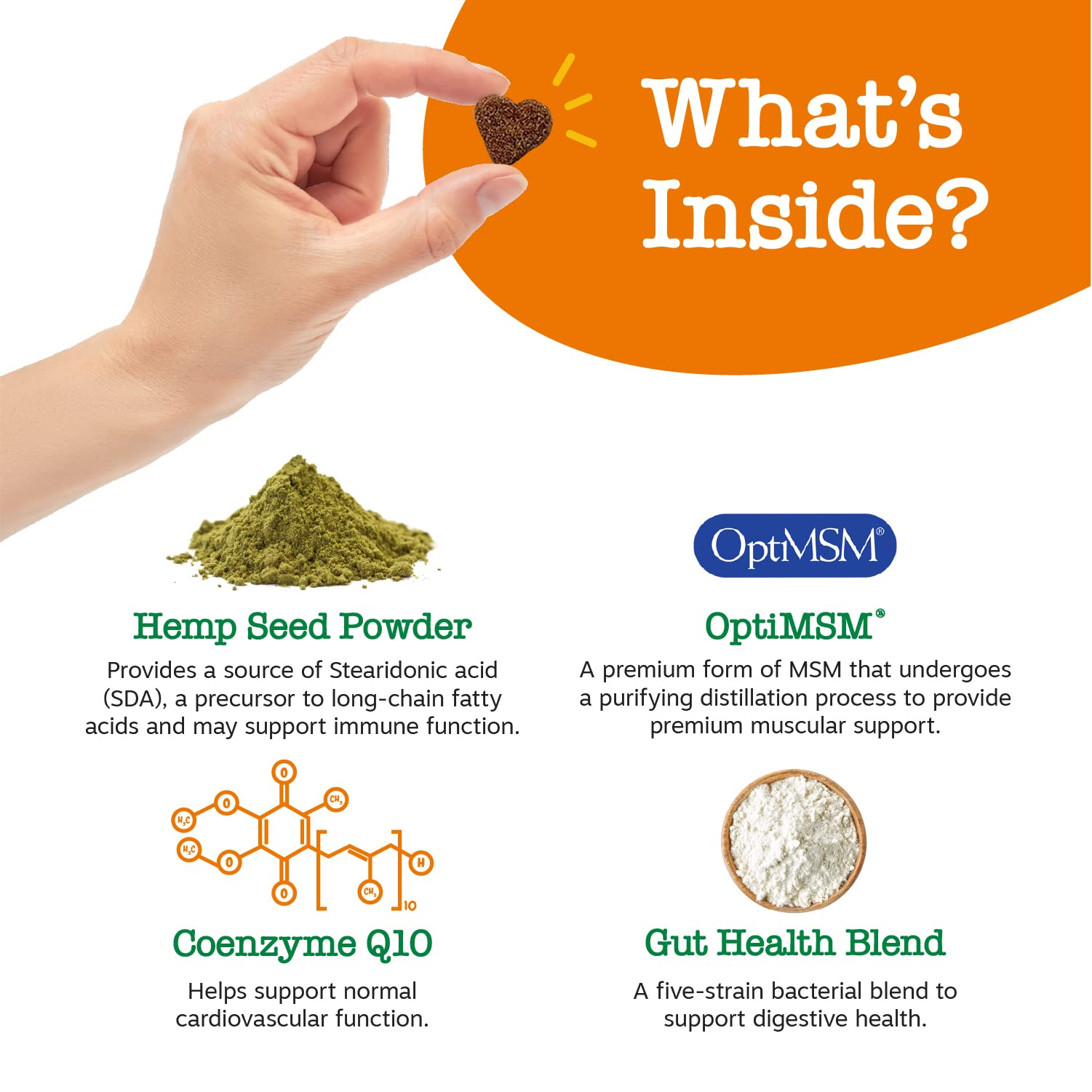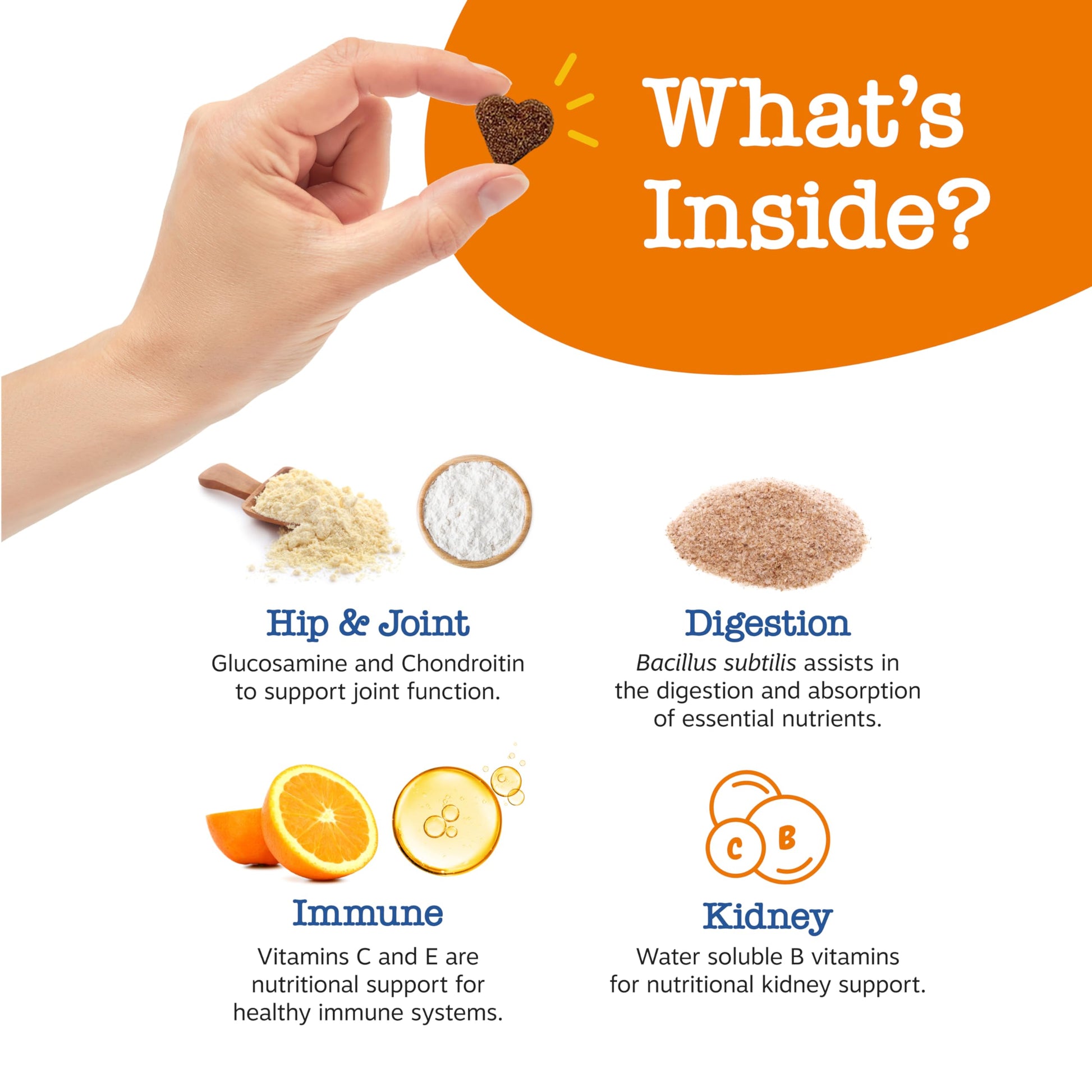 - Hip, Joint & Performance Support - Each dog chew features OptiMSM, a premium form of MSM for muscular support, which works synergistically with the Glucosamine HCl and Chondroitin Sulfate in these chews for hip and joint support plus Cod Liver Oil and B-Complex Vitamins support normal physical performance.